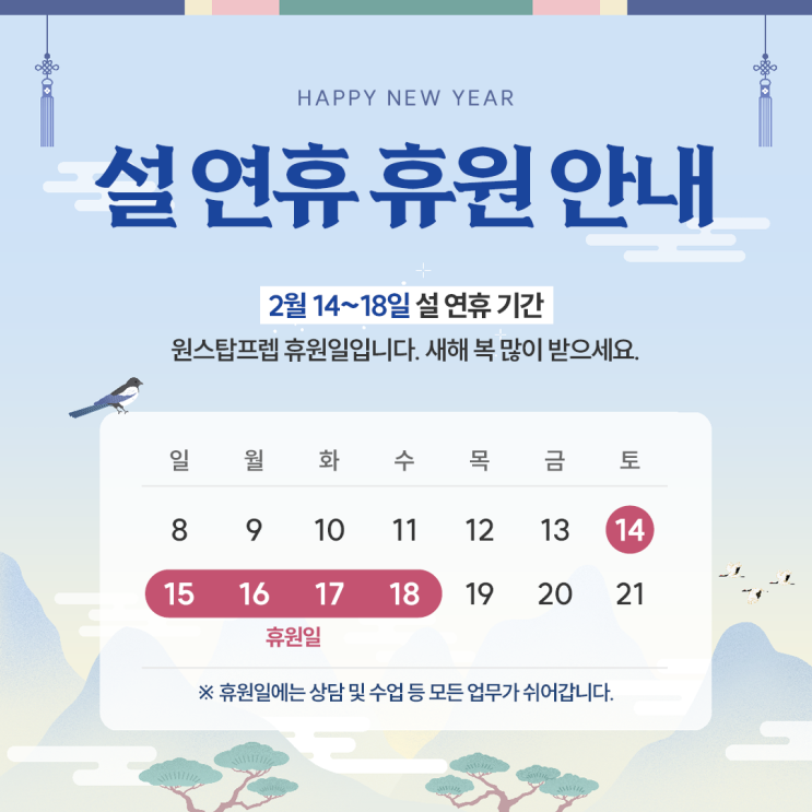 2026년 설 연휴 휴원일 안내 원스탑프렙 상담 및 수업 등 모든 업무가 아래 일정에 쉬어갑니다. 2026년 2월 14일(토) ~ 2월 18일(수) 새해 복 많이 받으세요! <img src="https://blogthumb.pstatic.net/MjAyNjAyMTNfMTYg/MDAxNzcwOTU2NzYwNDUz.ugW6YYfC4YiUXKUeJCKTgVc5XIXmcy3aav07AO38FpAg.c3omggl9_Cy14ZDjkxkYW3xGocM8DwZeZQJ5g-zSkPwg.PNG/OSP_2026-2%C8%DE%BF%F8%C0%CF%BE%C8%B3%BB_sns_26-02-13.png?type=s3" />