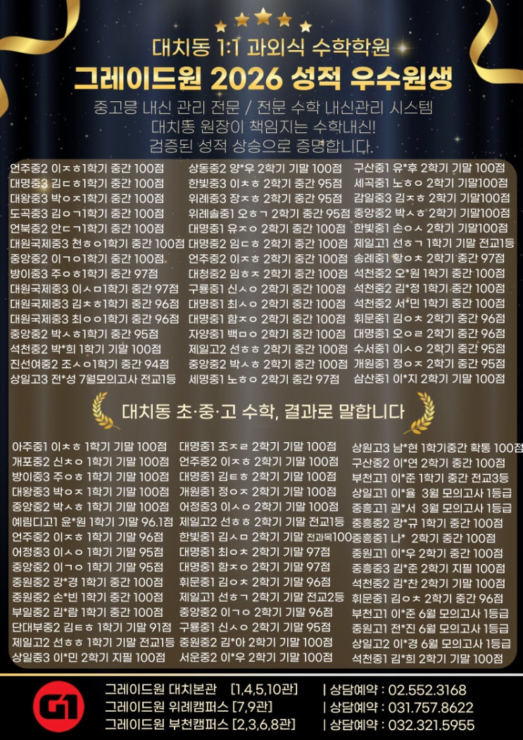안녕하세요! 학생을 위한 개별 맞춤수업으로 수학성적 향상을 책임지는 대치동 은마아파트 사거리 근처에 위치한 초·중·고 1:1 수학학원 그레이드원 수학학원입니다. 오늘은 작년에 우수한 성적을 낸 2026년 성적우수원생 소식입니다 ^^ 그레이드원에서는 단순한 문제풀이 중심 학습이 아닌, 학생별 학습방향과 목표에 따른 일대일 맞춤 학습으로 수업을 진행하고 있습니다. 앞으로도 학생들의 학업에 함께하며, 더 많은 성취를 이끌수 있게 지원하는 그레이드원이 되겠습니다! 열심히 노력해 준 우리 학생들, 정말 고생 많았고 항상 응원합니다 앞으로도 학생들의 성장을 함께 만들어가는 그레이드원이 되겠습니다. 감사합니다 :) 등록문의....... <img src="https://blogthumb.pstatic.net/MjAyNjAxMDZfMjkz/MDAxNzY3NjkzMTMzNTU5.--wIv6gZ6pSFhBWVkXzNanL6U7fUQt7oS3Yx_OVsBJUg.5bOEYCS9XS5nxm2YIHJRPJLL5DVIHvBUrpIEOanmuZ0g.JPEG/2026%C7%D0%B7%C2%BF%EC%BC%F6%C0%DA_%B4%EB%C4%A1.jpg?type=s3" />
