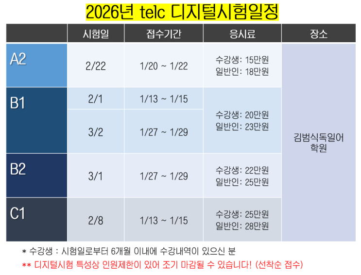 안녕하세요, 김범식독일어학원입니다. 2026년 2-3월 telc 디지털 시험 일정이 공지 되었습니다. 시험 접수기간 내에만 접수 및 환불이 가능하며 디지털 시험의 특성상 인원제한이 있기 때문에 빠른 신청 부탁드립니다. 또한 접수 기간 첫날 오전 10:00 이전에 접수하신 내역은 무효 처리가 되오니 이 점 유의해주시기 바랍니다. 시험 접수 및 문의사항은 아래 카카오톡 채널을 통해 상세하게 안내 도와드리겠습니다! 감사합니다. https://pf.kakao.com/_JxkFxfC <img src="https://blogthumb.pstatic.net/MjAyNjAxMTNfMTcz/MDAxNzY4Mjk5ODMyNzU2.wxhkhpQjmMBaK6-2rEzE8AHbcBlCpjw9AqT7Dz3fZ1cg.jTHVM85d2idfx1yrD9j6YMfpeWZ14SjSHEWZOSOnWx4g.PNG/%C4%B8%C3%B3.PNG?type=s3" />