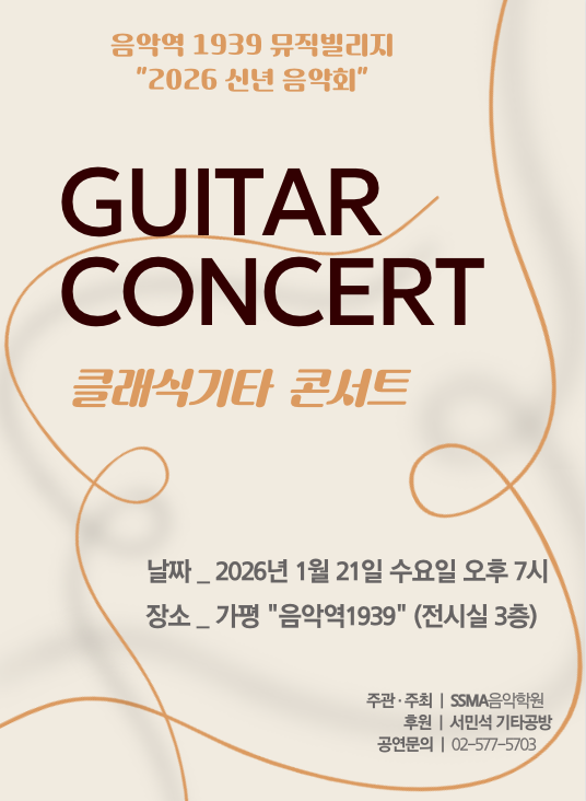 안녕하세요, SSMA의 기타 선생님들과 학생들이 총 출동하는 캠프와 연주 소식입니다. 2026년 1월 18일부터 22일까지 클래식기타 캠프가 있습니다. 이번에는 가평 시민들을 위한 전석 초대 연주회도 준비가 되어 있습니다. 많은 관심 부탁드립니다. <img src="https://blogthumb.pstatic.net/MjAyNjAxMTFfMjUy/MDAxNzY4MTMzMDY2MjM0.mNNpRxJLZnintbyVlpVLixF89yUYV9ViV5hKAad-wsog.lUaVG3G0zWpzLTmVu7KwdmBLnvvCHDA8SQCnd5RxiA4g.PNG/%BD%BA%C5%A9%B8%B0%BC%A6_2026-01-07_%BF%C0%C8%C4_7.59.30.png?type=s3" />