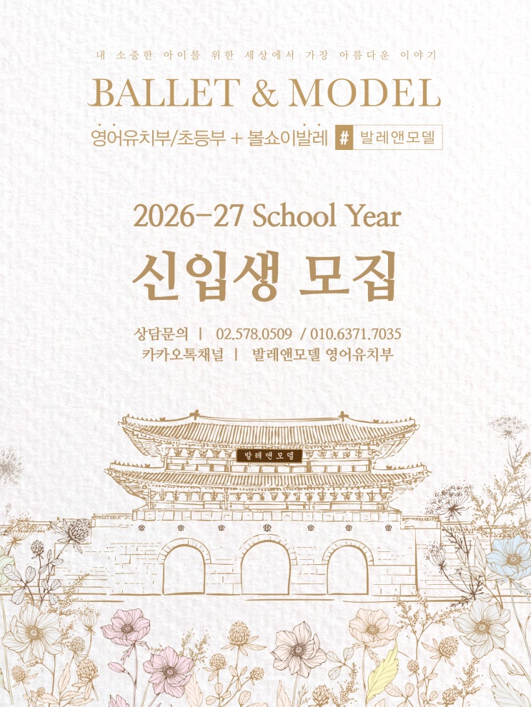 '발레앤모델 어학원' 은 3세 ~ 7세 영어유치부 + 전 연령을 위한 발레(예체능) + 초등부 프리미엄 예술 어학원입니다. 상담을 원하시거나 궁금한 점이 있으시면 아래 번호나 카카오톡으로 연락주세요 언제나 빠르고 친절하게 안내해 드리겠습니다 :) 수업에 대한 모든 문의는 전화 02-578-0509 / 010-6371-7035 카카오톡 친구 추가 '발레앤모델 영어유치부' 인스타그램 balletnmodel.kinder 을 검색하셔서 연락 주세요 :) 감사합니다! ' BALLET & MODEL 발레앤모델 어학원 ' 주소: 서울특별시 강남구 강남대로 292 , 뱅뱅빌딩 (뱅뱅사거리) 4층, 발레앤모델 어학원 상담 : 02.578.0509 / 010-6371-7035 내....... <img src="https://blogthumb.pstatic.net/MjAyNjAxMTJfMjk2/MDAxNzY4MTk3NDUwNTIx.gNdvmhUBTcE4264iLNTskSZHwlj2cNfc469LqK1Z2_Ig.a0RX5ZcGUKmlUGYijwokgAduht2TvVG5TK-9oPZIwtkg.JPEG/%BD%C5%C0%D4%BB%FD%B8%F0%C1%FD%282026-27%29.jpg?type=s3" />