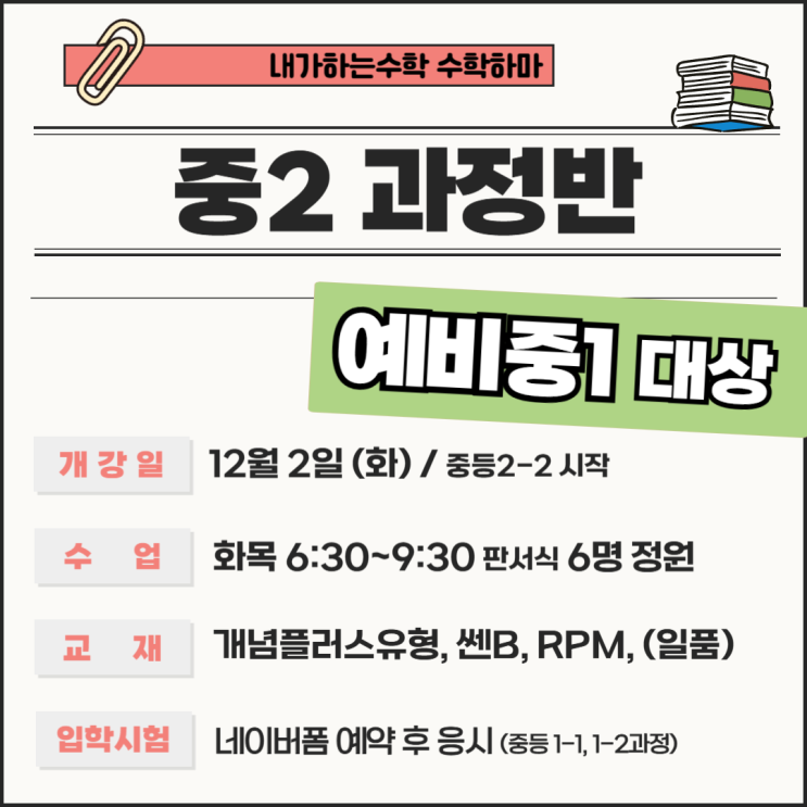 안녕하세요. 수학하마입니다. 현재 초6 대상(26학년도 중1)의 중등 과정 수업을 안내해 드립니다. 아래와 같은 학생을 위해서 준비된 반입니다. ▶️ 중학생이 중등 과정 공부하는 좋은 학원을 찾고 있어요. ▶️ 빠른 선행이 안 맞는 것 같아요. ▶️ 성실하고 의지가 있는 학생이에요. ▶️ 중등 과정 공부를 했는데 아직 자신이 없어요. ▶️ 중2-2학기에 고등 과정을 시작하는 것으로 충분해요. ▶️ 열심히 하는 동갑 친구들과 함께 공부하며 성취감을 느끼고 싶어요. ▶️ 문제를 풀며 개념을 다질 수 있도록 스스로 공부하는 시간을 충분히 갖고 싶어요. 수업 진도, 교재 별 기간, 중1과정 등 자세한 내용은 학원으로 문의 바랍니다. 친절....... <img src="https://blogthumb.pstatic.net/MjAyNTEyMDFfMTI1/MDAxNzY0NTkwMDg3NDkz.yhDi0QOkPtOHm4UUSa_QSaA2J8U-T5GooN5YGGr1lWwg.V_I5NJJ43ooyl7kEsOzIcdxg8DlviDDyl5alirhYGUsg.PNG/%C1%A6%B8%F1%C0%BB_%C0%D4%B7%C2%C7%D8%C1%D6%BC%BC%BF%E4_-003_%283%29.png?type=s3" />
