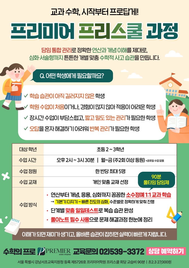 안녕하세요! 강남 대치동 수학전문 프리미어 학원입니다 초등 2~3학년은 수학의 기초를 다지는 가장 중요한 시기예요. 이때 연산이 흔들리거나 개념 이해가 약해지면 학년이 올라갈수록 심화 개념을 힘들어하는 경우가 정말 많습니다. 프리미어 프리스쿨 과정은 이런 고민을 가진 부모님들을 위해 준비된 기초 탄탄 + 습관 형성 맞춤 프로그램이에요. 특히, ✔ 아직 학습 루틴이 잡히지 않은 학생 ✔ 학원 수업이 처음이거나 적응이 어려운 학생 ✔ 장시간 수업은 부담스럽지만, 꼼꼼하고 밀도 있는 관리가 필요한 학생 ✔ 스스로 문제 해결이 어려워 반복 관리가 필요한 학생 이런 학생들에게 최적화된 과정이라 많은 학부모님들이 만족하고....... <img src="https://blogthumb.pstatic.net/MjAyNTEyMDZfNjgg/MDAxNzY0OTk4NjgyMjM0.TuCY9Rz8OtySR7LuuLlj63VEQ7FT560B1MyBV5EETr0g.BZ5mJDb6V9nfRi7_YHX4vt5WVD3MrBkd3mt6-dJpjLog.JPEG/%C7%C1%B8%AE%BD%BA%C4%F0.jpg?type=s3" />