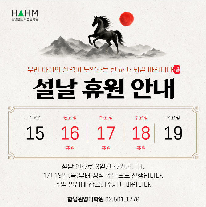 안녕하세요. 대치동 함영원영어학원입니다. 다가오는 설 연휴를 맞아 아래와 같이 휴원 일정을 안내드립니다. 휴원 기간 2월 16일(월) ~ 2월 18일(수) 해당 기간에는 수업이 진행되지 않으며, 2월 19일(목)부터 정상수업으로 진행됩니다. 학부모님들께서는 수업 일정에 참고해주시기 바랍니다. — 설 연휴 이후에는 중요한 입시 관련 일정이 이어집니다. 다음 주 토(2/21) 외대부고 입학테스트 (초6 ~ 중3 대상) 고교 설명회(양재고 · 언남고) 다음 주 일(2/21) 자소서 · 면접 전략 설명회(오후 1시) ( 위 일정 관련한 내용 확인 및 사전 신청은 아래 포스팅에서 확인해주시면 감사하겠습니다!) 입시를 준비하는 학생들에게....... <img src="https://blogthumb.pstatic.net/MjAyNjAyMTRfMTY2/MDAxNzcxMDMyNjQ5OTgw.NnybC5BhKeVq1lMjOkBmRNFWYfsiW6ObMxj5NLWJ3YMg.dy6JP5W0rA64htCKGkG3bjO5e1heX0jJQABoP5pLiWcg.PNG/image.png?type=s3" />