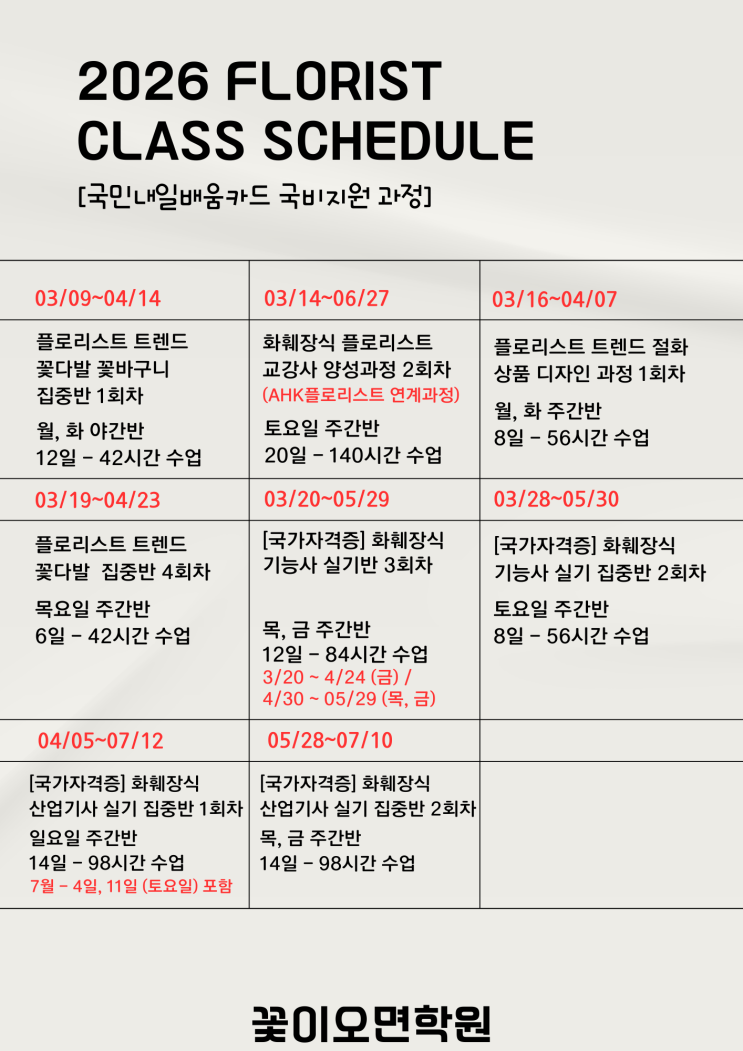 안녕하세요. 이제 낮 시간에는 날씨가 많이 따뜻해져서 봄기운이 완연한 요즘 입니다. 따뜻해진 봄에 꽃이오면학원에서 개강하는 국민내일배움카드 플로리스트 국비지원 과정을 안내 드립니다. ◆ 플로리스트 트렌드 꽃다발 꽃바구니 - 1회차 - 3월 9일 ~ 4월 14일 / 월, 화 야간반 [ 12일 - 42시간 수업 ] ◆ 플로리스트 트렌드 절화상품 디자인 과정 - 1회차 - 3월 16일 ~ 4월 7일 / 월, 화 주간반 [ 8일 - 56시간 수업 ] ◆ 플로리스트 트렌드 꽃다발 집중반 - 4회차 - 3월 19일 ~ 4월 23일 / 목요일 주간반 [ 6일 - 42시간 수업 ] ◆ 화훼장식 플로리스트 교강사 양성과정 - 2회차 - 3월 14일 ~ 6월 27일 / 토요일 주간반 [ 20일 - 140시간 수....... <img src="https://blogthumb.pstatic.net/MjAyNjAyMjdfMTEw/MDAxNzcyMTg3MTU1OTUw.ntgIjUu7MoEPMMvDpjVJ0pFd4cU2EoReVdLklB60npwg.JCR03SpHZwZ7wgZrlonz8YQfncLxfAxhAvWzGY-guZIg.PNG/%B0%B3%B0%AD%C0%CF%C1%A4_%C0%CF%C0%DA%BA%B0_%C1%A4%B8%AE_A4_-_20260227.png?type=s3" />
