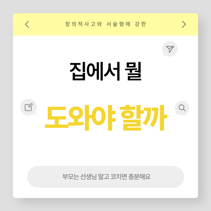 집에서 뭘 도와줘야 할지 모르겠어요. 상담할 때 정말 자주 듣는 말이에요. 요즘은 문제집, 강의, 정보가 너무 많아서 오히려 기준이 흐려지기 쉽거든요. 그런데 분명한 건 하나예요. 부모가 선생님처럼 가르치려고 할수록 아이는 더 빨리 지치고, 수학이 ‘부담’으로 굳어질 때가 많습니다. 집에서의 역할은 정답을 알려주는 사람이 아니라, 아이 생각이 밖으로 나오게 돕는 코치면 충분해요. 1) 가르치기보다 질문이 먼저입니다 아이가 막힐 때 “이렇게 풀면 돼”라고 알려주고 싶죠. 하지만 그 순간 아이는 ‘생각할 기회’를 잃어요. 대신 질문을 바꿔보세요. “문제에서 이미 아는 정보가 뭐야?” “지금까지 한 걸 그림이나 식으로 보여....... <img src="https://blogthumb.pstatic.net/MjAyNjAyMTBfNDYg/MDAxNzcwNzA0NDUxNzAw.1mfY2zzZc6G_uN80n2-bIsCe-fM8R32BQj2HDe7_CG8g.1Y2G0BzRh5dE3JN27zXHX0w8tU74jDV42q3vb684WDcg.PNG/001.png?type=s3" />