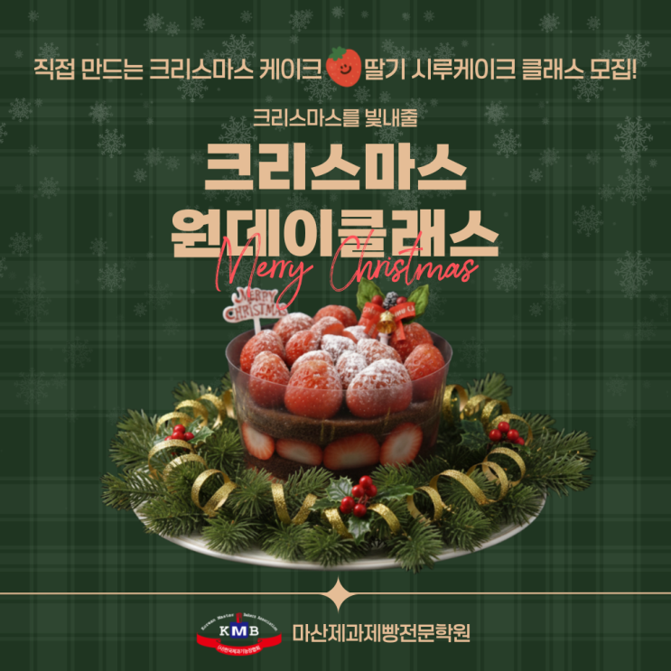 ✨ 올해 크리스마스, 가장 달콤한 순간을 직접 만들어보세요! 지금 바로 수업 신청하고 원하는 시간대로 참여하세요! ❄️ 직접 만든 딸기 시루케이크 한 조각의 설렘. 달콤한 향으로 가득한 실습실에서 나만의 크리스마스 케이크를 만드는 경험 생각만 해도 행복하지 않나요? 마산제과제빵전문학원이 준비한 단 하루의 특별한 클래스, 크리스마스 케이크 원데이 클래스 OPEN! 클래스 안내 대상 : 중·고등학생 / 대학생 / 직장인 누구나 수업료 : 40,000원 (재료비 포함) 정원 : 회차당 최대 15명 소수정원 정원이 빠르게 마감될 수 있습니다. 지금 바로 신청하세요! 수업 시간 1차 : 오후 14:00 2차 : 오후 18:30 수....... <img src="https://blogthumb.pstatic.net/MjAyNTEyMDhfMTU1/MDAxNzY1MTYyNTAyMTg3.a1lCVD1cHugn1cSD2hgoI1AF7JhU6OHDDtYJgPyZIRkg.oS8JLta5DNXPnjzIatnsl1pQfy3h8ZyS84KLpyMOSF4g.PNG/%C1%A6%B8%F1%C0%BB-%C0%D4%B7%C2%C7%D8%C1%D6%BC%BC%BF%E4_-001.png?type=s3" />