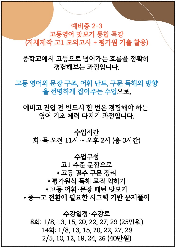 안녕하세요 브리튼 영어 대표원장입니다. 방학은 누구에게는 더 성장하는 기회가 되고, 누구에게는 흐름이 끊기는 시간이 되기도 합니다. 환경이 아니라 그 시간을 어떻게 사용하는지에 달려 있습니다. 우리 아이들의 공부의 점프업을 할수 있는 소중한 시간이라는 방학을 알차게 보낼수 있도록 특강을 준비했습니다. 특히 중2, 중3의 방학은 영어의 절대적인 시간입니다. 중1보다 중요한 중2,중3의 시간을 위기가 아니라 기회로 만드는 시간이되길 바랍니다. 이상, 브리튼 영어에서 전해드렸습니다. <img src="https://blogthumb.pstatic.net/MjAyNTEyMDlfMjM4/MDAxNzY1MjQwNTUwMjk3.wv4LMsXr-ngIkB4PJmIUOOzWda_8P_73spSN173tLbog.F5_uAWPyJYfhj09Tr6oo0Kr81IGV-ELbFpIwjx8jeg8g.JPEG/001.jpg?type=s3" />