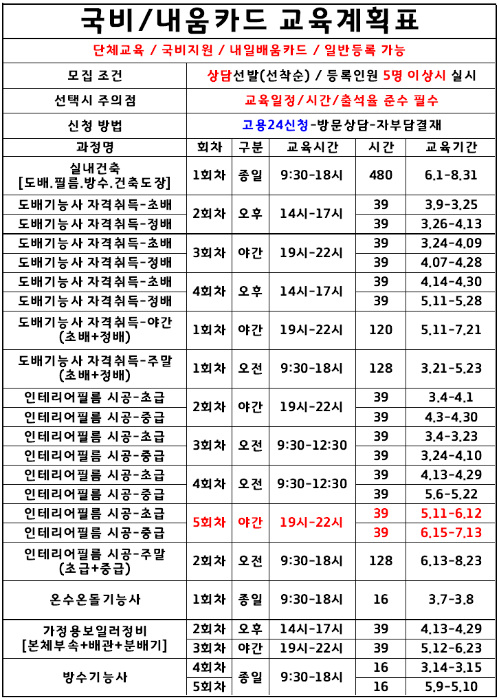 배움인테리어기술학원 과정명.교육비.교육일정.교육시간 모두 확인하신후 수강신청문의 및 상담예약 바랍니다. 내일배움카드 국비교육은 등록상담필수(출석율,실업자취업) 상담일 주차는 CGV 지하주차장 이용 교육일정은 변경될수 있습니다. 훈련생 등록시 변경일정 알려드려요 교육문의.상담예약 ☎055-603-0999 [월~금]10시~18시 점심시간 : 12:30~14시 상담시간 예약해 주세요~~ 배움인테리어기술학원 근무시간 전.후 문의 ★ 핸드폰 문자 접수 ★ [아래 링크 클릭하시면 됩니다] 1. 수강하실분 성함 2. 연락가능한 핸드폰번호 2. 신청하실 훈련과정 3. 근로유형 : 근로(알바)/실업/사업자 업무시간에 순차적으로 간략하....... <img src="https://blogthumb.pstatic.net/MjAyNjAzMDZfNzkg/MDAxNzcyNzY1Nzk4NjU0.En-O1MXWIC_gEHoTCVSpa-0AJU47J1yvqnDtjtQASwkg.fzkRdxe3net0f__9dFjnGzRd_MaM4CdgW_9D4ZifO3wg.PNG/image.png?type=s3" />