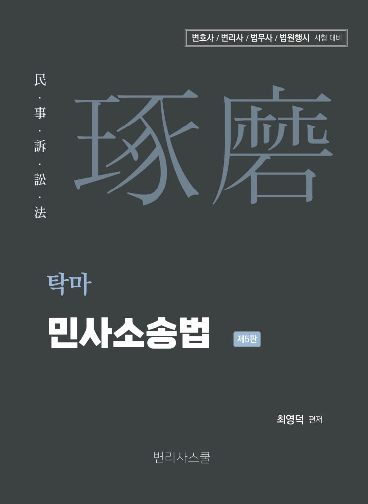 제5판을 내며 2025년도는 다양한 국가적 변혁기에 있으면서도 반대로 민사소송법을 중심으로 한 민사법적 문제는 기존의 법적 안정성을 추구하면서 크게 달라진 점은 없습니다. 그럼에도 불구하고 4판이 모두 소진되어 결국 5판을 내야하는 상황에 이르렀습니다. 5판에서는 4판에 기존 기출문제에 출제된 예외적 판례를 추가하면서 2025년 판례 변경된 대법원 2025. 10. 23. 선고 2021다252977 전원합의체 판결 등 2025년 중요판례를 추가하였습니다. 또한 오기를 바로잡고 서술상 편하게 이해할 수 있도록 수정한 부분이 있습니다. 이 부분은 변리사 제1차 시험을 끝내고 정성스럽게 교정해준 구민재 수험생에게 고마움을 전합니다. 이 책을 통....... <img src="https://blogthumb.pstatic.net/MjAyNjAzMDVfMTQ2/MDAxNzcyNjY5MzUxNDA5.mlbRN_jdj24aGm16BU3rZPL_aJETqFQ6sxezFoese7Ug.4WP_N6RFNYhLGLnnl58n376rDiGnm5WVJMLGolRKRiMg.JPEG/%C5%B9%B8%B6%B9%CE%BB%E7%BC%D2%BC%DB%B9%FD_%C7%A5%C1%F61500.jpg?type=s3" />