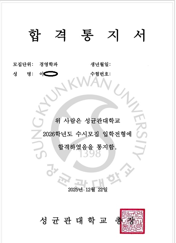 일타와 함께 쌓아온 실력으로 끈기있게 달려온 노력의 결실이 맺어졌습니다. 진심으로 축하하고 앞날을 응원합니다. 어머니도 고생 많으셨습니다.~ 신서고 졸업예정 일타수학 재원기간: 2년 9개월 수시 성균관대 경영학과 합격~!!! 수시 서강대 경제학과 합격!!! 수시 중앙대 경영학과 합격!!! 진짜를 만나면 바뀐다!! 일타수학학원 02-2648-9837 양천구 목동 벽산미라지타워 3F 1관,2관 <img src="https://blogthumb.pstatic.net/MjAyNjAyMTFfMjA5/MDAxNzcwODE2NjgyNzY0.eyH6OW8PHV6tgTQLC1CUribXQzx8CIzoznYuF--u5_gg.rVMWnSoy1Wi_9KKhSilhJLtqc4dbyW4g_Fg74OhBfDog.JPEG/%BC%BA%B1%D5%B0%FC%B4%EB_%B0%E6%BF%B5.jpg?type=s3" />