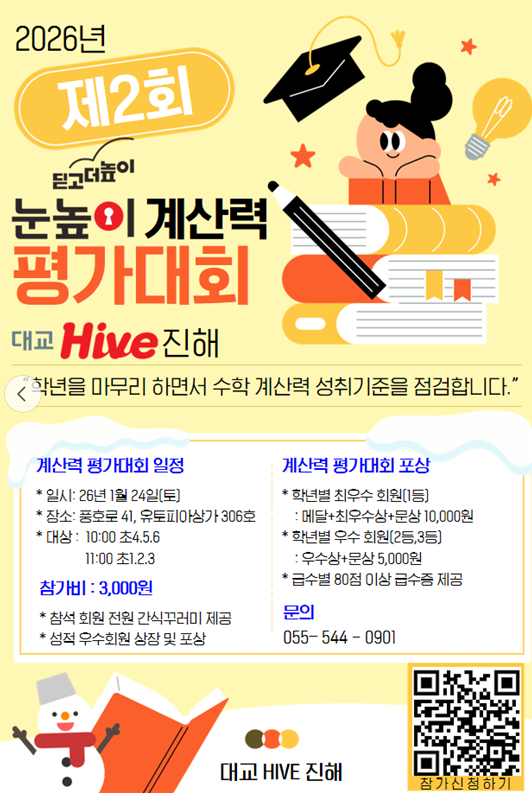 안녕하세요 눈높이 장천학원입니다. 1월 17일(토), 우리 진해Hive에서 계산력평가대회를 진행했습니다. 연산력은 단순 계산 능력이 아닙니다. ✔ 수학 자신감의 시작 ✔ 사고력의 기본 토대 ✔ 중·고등 수학을 버티는 힘 기초가 단단한 아이가 결국 멀리 갑니다. 진해 눈높이 장천학원은 아이들이 기본기에 강한 실력을 갖출 수 있도록 체계적으로 지도하고있습니다. 우리 눈높이 장천학원 친구들도 많이 참여했는데요~~ 시험을 앞두고 “잘 치고 오자!”는 의미로 아이들에게 작은 간식을 나누어 주었습니다. 긴장한 표정으로 간식을 받아 들던 아이들 서로 “할수있다~~~~~~!” 하며 다짐하는 모습이 참 대견했습니다. 진해Hive 계산....... <img src="https://blogthumb.pstatic.net/MjAyNjAyMTJfMjMg/MDAxNzcwODc3MzE1MzAz.X4XmRYW_dDAcJ0LVtuASj6iCgofqTaWqjDDkCVOYSj4g.jR1M5K1szsOOXic9Mf9tTqjQ44URdlh8RYmjTXjm1jkg.PNG/KakaoTalk_20251230_161500089.png?type=s3" />