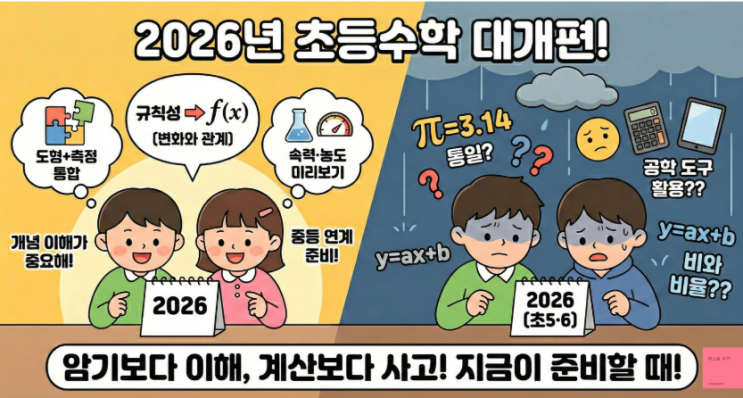2026년 3월, 초등 5·6학년부터 전면 시작 2022개정 교육과정은 학년별로 단계 적용됩니다. 2026년3월부터 드디어 초등5,6학년에도 새 교육과정이 시작되는데요. 이미 2024년 1,2학년,2025학년 3,4학년을 거쳐 최종 초등 단계에 도달한 것입니다. 즉 2026학년 현재 5학년이 되는 아이들이 처음으로 새 교육과정 수학을 배우게 됩니다. 교과서도 바뀌고 단원 구성도 달리지며 심지어 일부 내용은 새로 추가되거나 삭제됩니다. 지금부터 하나씩 살펴볼게요. 수학의 틀이 바뀐다 — 5개 → 4개 영역 개편 가장 큰 구조적 변화는 바로 수학영역 개편입니다. 기존 2015개정 교육과정에서는 5개 영역이었지만 이제 4개영역으로 통합/재편됩니다. 특히 초....... <img src="https://blogthumb.pstatic.net/MjAyNjAyMjBfMTU3/MDAxNzcxNTcyODA0NDU1.ODo1K_SVN_6-fPFq_2aOhq8wQRBhHd7URaw4zAVMLJog.w87WxNOLmvm-KTOViKpKnJVGnW3Fve1PcYh6s_jxCo4g.PNG/2201.png?type=s3" />