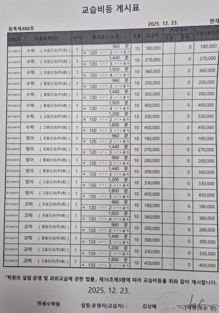 교습비 안내입니다. <img src="https://blogthumb.pstatic.net/MjAyNjAxMjFfMTIg/MDAxNzY4OTcxNzM1NDA3.SShA-sn8mmsh98Uux4q7sB-NYZm7KFpR0SuPlKxDpBQg.fkNitRZGuw0TbFABz38nZakEhe8ptm4jVTQ6po7Gk1Ug.JPEG/900%A3%DF20251223%A3%DF181645.jpg?type=s3" />