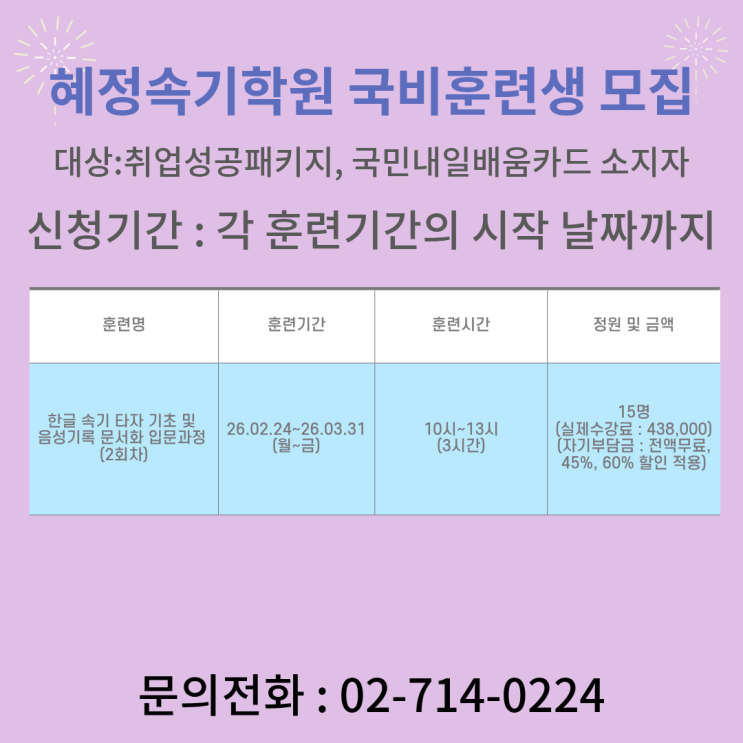 국비지원 속기학원, 혜정속기학원 추가 개설! 처음 시작하시는 분들을 위한 기초반 모집 “속기를 해보고 싶긴 한데, 키보드도 없고, 내가 과연 할 수 있을지 모르겠어요…” 이런 고민으로 망설이시는 분들께 정말 좋은 소식입니다 혜정속기학원에서 국비지원 속기 과정이 추가 개설되었습니다. ✅ 처음 오시는 분들, 정말 괜찮을까요? 괜찮습니다. 정말 ‘처음’부터 시작합니다. 이번에 개설된 과정은 **「한글속기타자 기초 및 음성기록 문서화 입문과정」**으로 속기를 한 번도 접해보지 않으신 분들도 기본 자리 잡는 것부터 하나하나 알려드립니다. 교육 일정 안내 훈련기간 : 2026.02.24 ~ 2026.03.31 훈련시간....... <img src="https://blogthumb.pstatic.net/MjAyNjAxMjNfMjg1/MDAxNzY5MTQzNzQ4NjU0.nuZmVlQMt0-PZWrny3IIUnIHaGqbK7RsPJZhDaetje8g.ZXuvhk4uJ9sOGyhbvyYcdHEckoHBrbphPz960aEC9YEg.PNG/KakaoTalk_20260120_145541537.png?type=s3" />