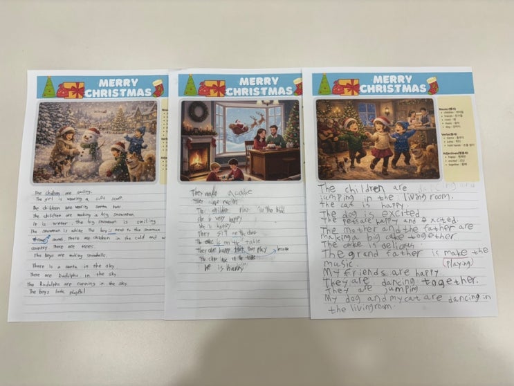 안녕하세요. 봄 영어입니다 Merry Christmas 저희 봄 영어는 크리스마스를 맞아 아이들과 함께 ‘Christmas’를 주제로 Writing 활동을 했어요. 단어암기와 시제보다 문장을 끝까지 완성하는 것, 그리고 자기 생각을 영어로 말해보는 경험에 의미를 두었어요 짧은 문장이지만 “영어로 내 마음을 써봤다”는 경험 자체가 아이들에게는 큰 성취감이 되었을 것 같아요. 처음에는 부정적인 모습을 보이던 친구들도 어느새 문장을 끝까지 써 내려가는 모습을 보며 작은 성장을 느낄 수 있었어요 앞으로도 일상 속 이야기와 특별한 주제로 아이들이 영어를 부담스러운 공부보다는 자신의 생각을 표현할 수 있는 언어로 느낄 수 있도록 라....... <img src="https://blogthumb.pstatic.net/MjAyNjAxMDVfMjg2/MDAxNzY3NjE3NjA1ODg2.QRmQ45OhRtk2OwER5K4XaFMxRi6MvzlPcMYT9H2lZN4g.BOwWHhP5bkG3zbZLmgOehHQtpEELnHvHIigaXpDnO7Yg.JPEG/output%A3%DF2665737162.jpg?type=s3" />
