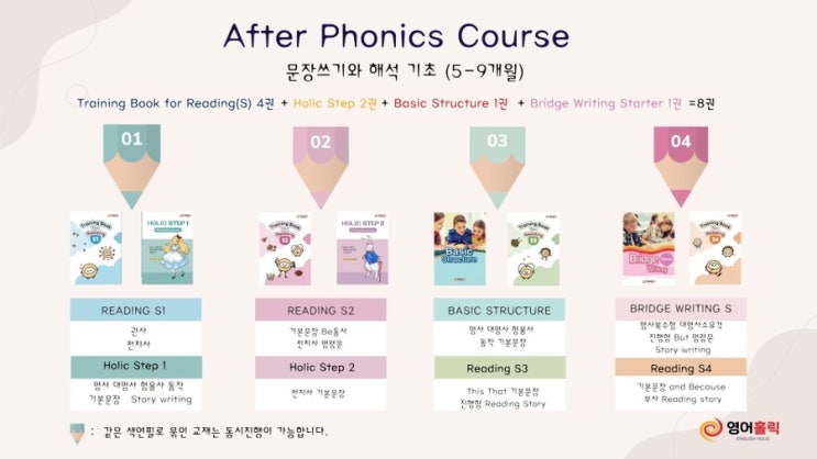 안녕하세요. 봄 영어입니다. 오늘은 저학년 친구와 함께한 영어홀릭 수업 7개월의 변화를 기록해 보려고 합니다. 7개월 동안 After Phonics 코스를 모두 마치고, 현재는 Story Writing 코스의 Bridge Writing 1을 진행하고 있습니다. ⬇️ 교재를 완료한 후에는 Achievement Test를 통해 학습 결과를 점검합니다. 부족한 부분은 보완하고, 다음 단계로 자연스럽게 이어지도록 지도하고 있습니다. 테스트 마지막에는 각 교재에서 학습한 문법을 활용하여 자유롭게 글을 쓰는 활동으로 마무리합니다. 이를 통해 아이들은 배운 구조를 바탕으로 스스로 문장을 만들고 확장하는 경험을 하게 됩니다. 자신이 쓴 글이 이미지로 만들어지면 아이들이....... <img src="https://blogthumb.pstatic.net/MjAyNjAzMTdfMjEz/MDAxNzczNzU2NDA2NzEx.jJz-jyrpgzhcP2NWSaZwjyOCn9QN9pe3todvulOxYGUg.x_WX4ZtklgxBd3q-4YuljvCBTw4brHGwLGpsNhRRHBEg.JPEG/IMG%A3%DF4558.JPG?type=s3" />