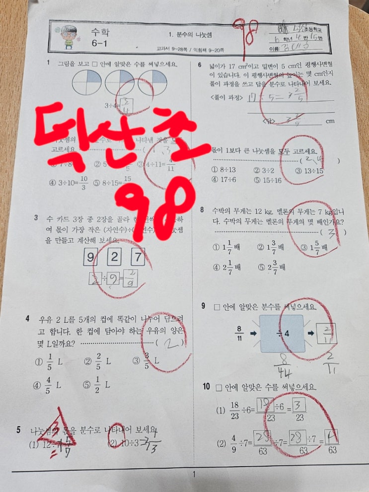 [진해 자은동 수학] 덕산초 6학년 단원평가 98점!