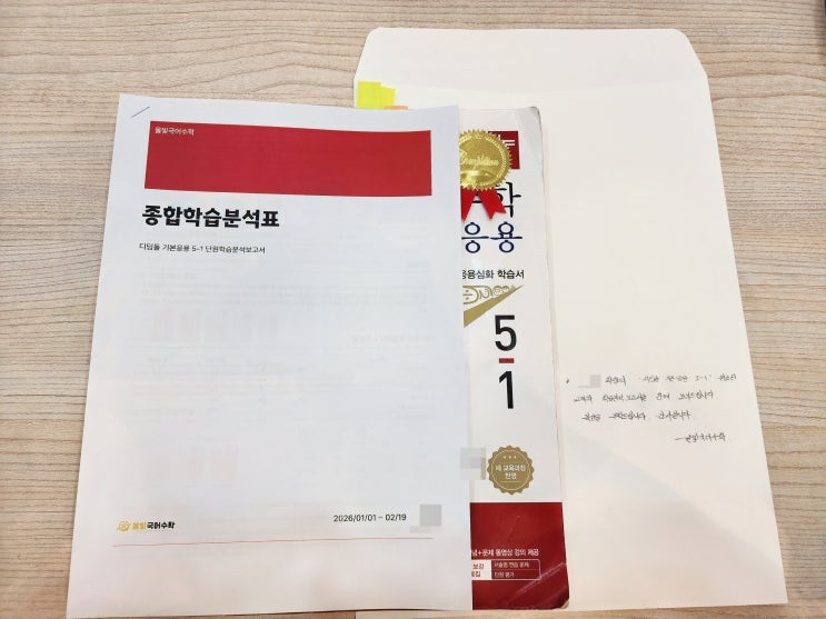 세상에 빛나지 않는 별은 없다! 안녕하세요. 진해 국어, 수학 학원 올빛국어수학입니다. 초등 수학 5-1 교재가 완 북 되었습니다. 수학은 타임별 최대정원 4명으로 1대1 맞춤형 수업을 실시하기 때문에 학생마다 사용하는 교재와 진도가 상이합니다. (디딤돌, 쎈, 최상위 수학S 등 사용) 덕산초 5학년 김OO 학생의 '완북' 달성을 축하합니다! '완북'된 교재에는 인증마크인 completion(완료) 스티커를 부착합니다. 교재는 기본적으로 맨 처음부터 끝 페이지까지 모두 완료하며, 채점은 선생님의 직접 채점을 통해 풀이과정에서의 문제점을 진단하고 이를 학생에게 피드백하고 있습니다. (서술형 답안 작성 첨삭지도!) 또 모....... <img src="https://blogthumb.pstatic.net/MjAyNjAyMjRfMTcy/MDAxNzcxOTEwODEyNTMz.mExHnGBzvDqBUZCVxAyEPMjiy6cUFAGtM5AoPDzVGK8g.Nwz3wZr_NQKoe_5ohRDDZlFyX0jqiydSlFRBqwDLtT0g.JPEG/20260219_151156.jpg?type=s3" />