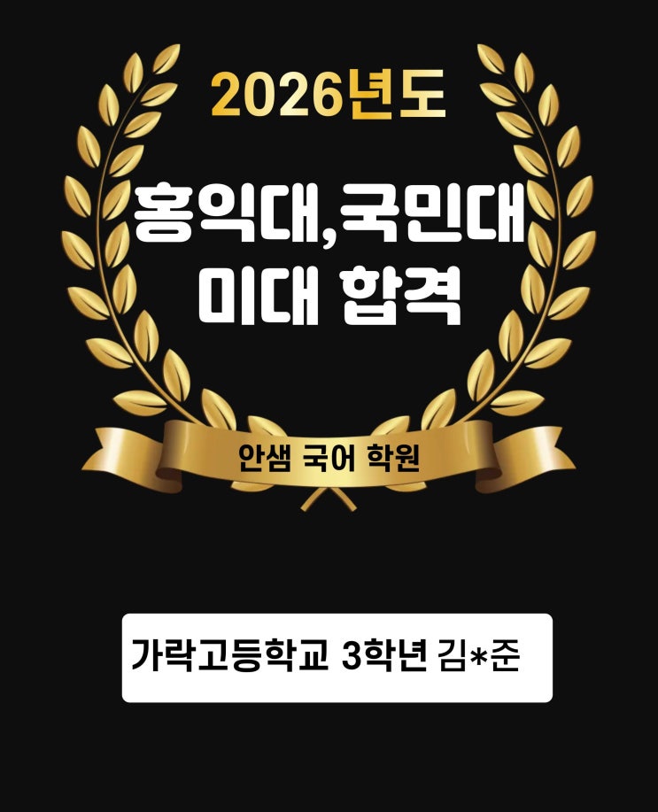 안녕하세요! 안샘학원입니다~~ 새학기가 되기 전 좋은 소식이 있습니다~ . . . 바로 저희 안샘국어학원을 고등학교 3년동안 열심히 다닌 가락고3 학생의 합격 소식인데요~~ 홍익대, 국민대 미대를 합격했다고합니다! 위 학생은 고등학교 입학초에 학원에 처음와 50점대로 시작하여 고3까지 꾸준히 안샘학원에서 공부한 결과 고3 모의고사를 안정적인 1등급, 국어 전교 등수 반석차 1등, 전체2등까지 최상위권의 국어 실력으로 올릴 수 있었습니다~! 저희 안샘 국어 학원에서는 원장님의 꼼꼼한 내신 직강과 조교들의 자체 제작 자료들로 수업이 이루어져있는데요~ 국어 내신공부에 큰 도움이 되었다고 합니다!! 또한 최상위권 성적을 낼 수 있었....... <img src="https://blogthumb.pstatic.net/MjAyNjAyMDdfOCAg/MDAxNzcwNDQ1OTU4MDI2.08zxZE5Gy5pEUYelrkEyljK7Fx2f-paYNr0S1sXp8v4g.UHNCw9yJBfj1xL_x668mcpuxnBIwrz3swfRR2n8OxFQg.JPEG/%C1%A6%B8%F1%C0%BB_%C0%D4%B7%C2%C7%D8%C1%D6%BC%BC%BF%E4..jpg?type=s3" />