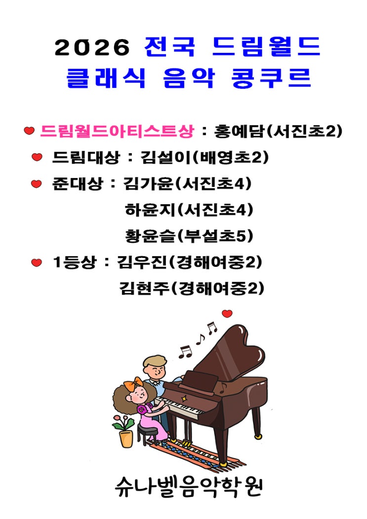 3월2일 2026 전국 드림월드 클래식 음악 콩쿠르에서 슈나벨음악학원 입상소식을 전합니다. 학생들의 재능을 꽃피운 순간이었습니다. 주말까지 연습에 소홀하지않고 노력하여 이렇게 멋진 열매를 맺었네요. 자랑스럽고, 이 학생들 덕분에 더 열심히 가르치고 싶어집니다. 축하해요, 우리 스타들!. #진주피아노학원 #2026년드림월드음악콩쿠르 #진주피아노콩쿨대회 #평거동피아노학원 <img src="https://blogthumb.pstatic.net/MjAyNjAzMDNfOTEg/MDAxNzcyNTQ1MTg4ODEy.0-Bu1QX0IOpMbI_cLoiCHEjkoNf3oW2Tm6orpOSdCbkg.0g955uWjy6LHsWoB0m0xZdsQ4leEb6CQftRi68o-WWsg.JPEG/1772539848126.jpg?type=s3" />