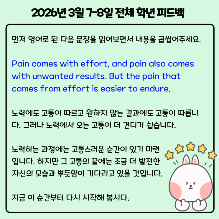 어제 우리 원에 새로운 학생이 첫 등원했습니다. 처음 오는 날은 아이도, 부모님도 괜히 긴장되는 날이죠. 낯선 공간에 처음 만나는 선생님, 처음 해보는 방식까지 모든 게 낯설 수밖에 없으니까요. 예상대로 어제 학생도 처음엔 조금 굳어 있었습니다. 그런데 수업이 시작되고 나서는 달랐어요. 어느 순간부터 표정이 풀리더니, 차분하게 수업을 따라오기 시작했습니다. 영어 문장을 읽을 때도 또박또박 읽으려 했고, 모르는 발음이 나와도 그냥 넘기지 않고 끝까지 붙잡았어요. 첫날인데도 그런 모습을 보여줬다는 게 솔직히 인상적이었습니다. 영어 실력은 가르치면 늡니다. 근데 해보려는 태도는 쉽게 만들어지지 않아요. 그래서 이런 학생이....... <img src="https://phinf.pstatic.net/image.nmv/blog_2026_03_04_3784/JZqd5FShjB_01.jpg?type=f480x480" />