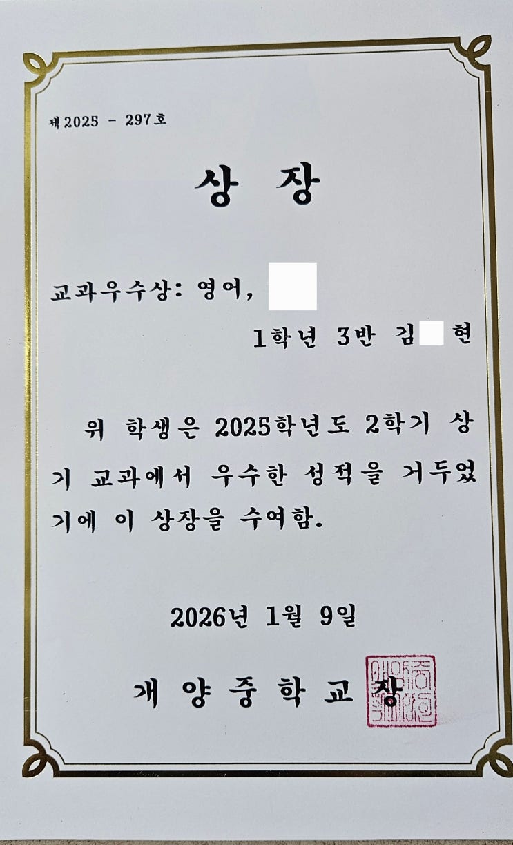2025학년도를 마무리하며 더베럴 영어에 매우 기쁜 소식이 하나 전해졌습니다. 꾸준히 공부해 온 한 학생이 2025학년도 학과 우수상을 수상했습니다. 이번 수상은 단기간의 성과가 아니라, 평소 성실한 학습 태도와 안정적인 실력을 바탕으로 한 해 동안 꾸준히 쌓아 온 노력을 결과라고 생각합니다. 수업 시간마다 집중력 있게 임하고 주어진 과제를 책임감 있게 수행하며 자신의 학습을 스스로 점검해 나가던 모습이 이런 결과를 이루도록 했습니다. 한결 같은 자세로 공부에 임한 우리 학생에게 진심으로 축하의 마음을 전합니다. 또한 늘 믿고 지지해 주신 학부모님께 깊이 감사 드립니다. 성과는 올바른 방향과 태도가 만들어 냅니다. 더베....... <img src="https://blogthumb.pstatic.net/MjAyNjAxMTNfMTE4/MDAxNzY4Mjc4ODgyNTcx.DeeN_mjzw7UwfaDPdO4k34FR9ZGJ6aC5uYNoFYO8xXkg.MF5V0Dgb4EH7BAECvsY4NHpicxgOMKOdHQAGmxUQI1Qg.JPEG/KakaoTalk_20260113_132331216.jpg?type=s3" />