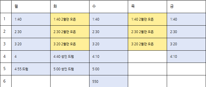 진주드럼학원 유치부 초등부 성인 시니어 특수아동 청소년 음악학원 두근두근 타악기 시간표 확인