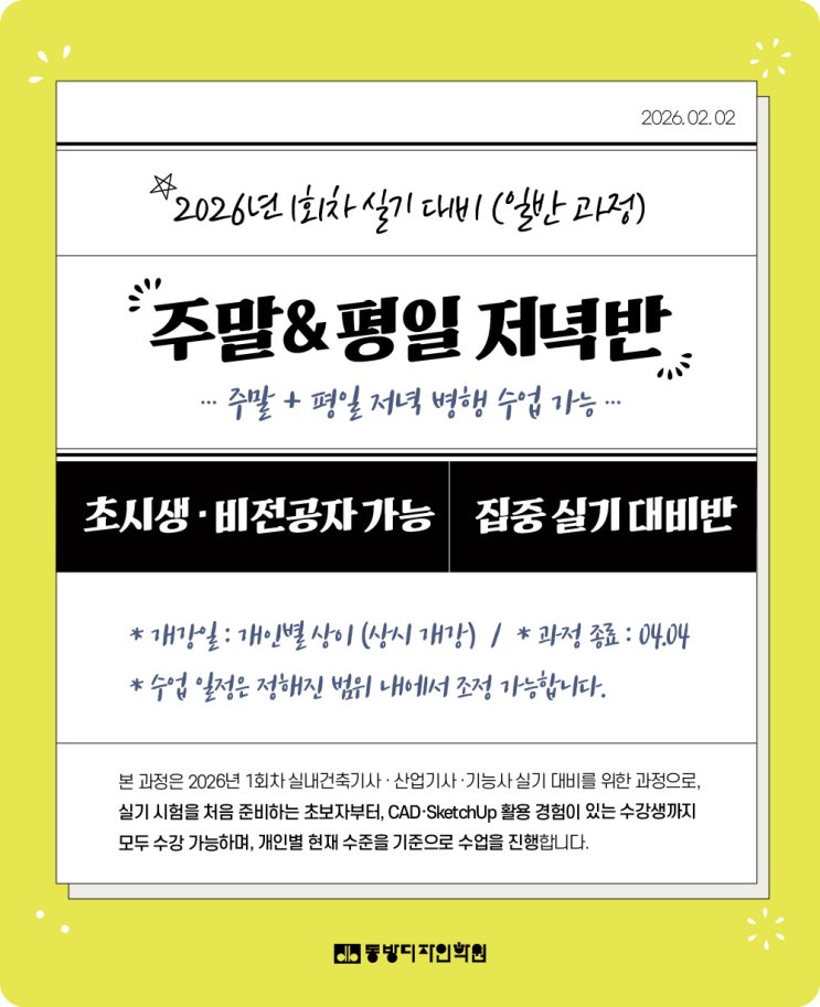 안녕하세요, 동방디자인학원입니다 :) 2026년 1회차 실내건축기사·산업기사 실기시험을 준비하고 계신가요? 4월 중순 예정인 1회차 실기시험 특성상, 국비과정으로는 1회차 대비가 어려운 시기입니다. 그래서 1회차 시험을 목표로 하시는 분들께는 일반과정 중 ‘주말 + 평일 저녁 병행 수강’ 방식이 가장 현실적인 선택이 됩니다. 주말 + 평일 저녁 병행 수강 (일반과정) 이번 일반과정은 주말 수업을 중심으로 하되, 평일 저녁 수업을 함께 병행할 수 있도록 운영됩니다. - 평일 수업은 정해진 범위 내에서 요일 선택 가능 - 주말 수업만으로 부족한 실습 시간을 평일 저녁에 보완 - 1회차 실기시험 일정에 맞춘 집중 대비 가능 특히 2월....... <img src="https://blogthumb.pstatic.net/MjAyNjAyMDdfMTY1/MDAxNzcwNDI0MjY0ODQ5.dKmOeKZtkcayOpQfSJpV8B2-Fs23HQFbrT7oE0YmcSEg.uP79hJVJjoP3y1vr7GKOwEBcmYqvz-9bn558CPtgG4sg.JPEG/weekend-class_260202.jpg?type=s3" />