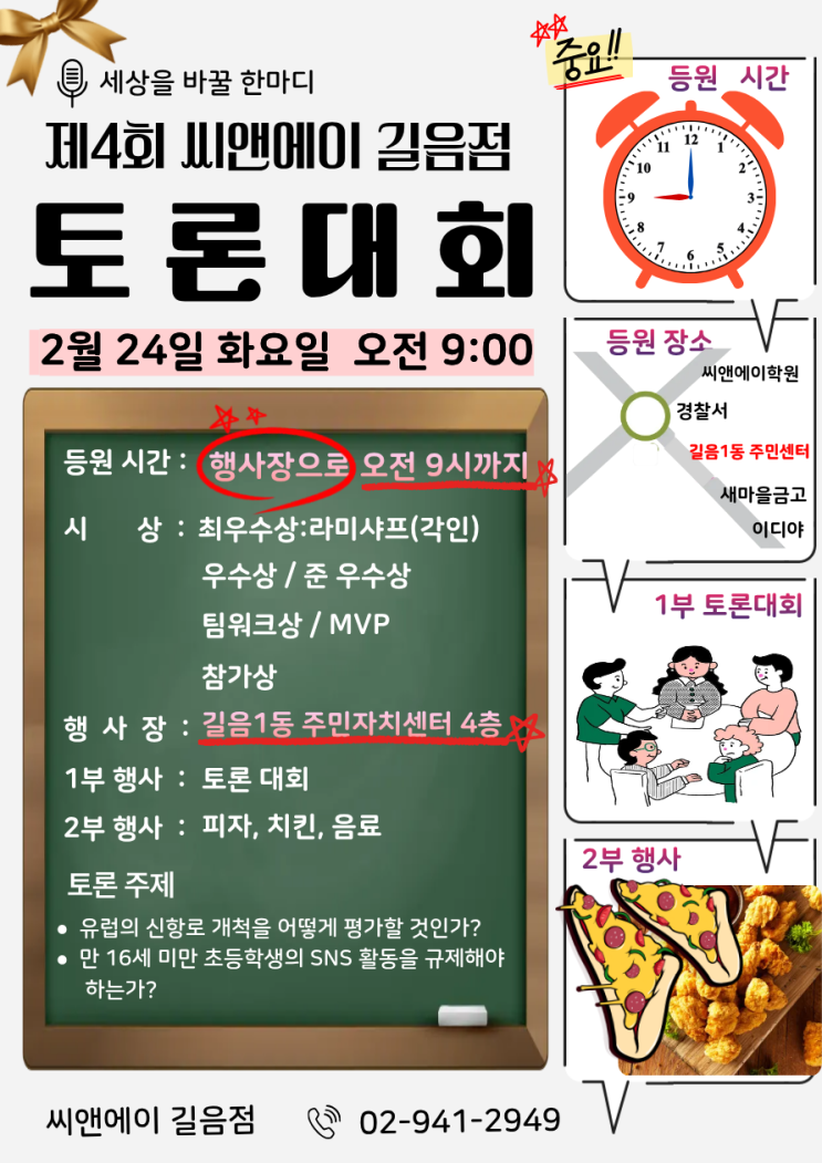 초6 대상 토론대회에 재원생의 70%가 참여하게 되었습니다 참여해 주신 학생여러분께 감사드립니다 열심히 준비해서 좋은 추억 만드시기 바랍니다 일정: 2월 24일 화요일 오전9시 (시간 엄수) 등원 장소: 길음1동 주민자치센터 4층 대강당 1부 토론대회 (길음1동 주민자치센터 4층 대강당) 2부:피자&치킨 <img src="https://blogthumb.pstatic.net/MjAyNjAyMDdfMTg3/MDAxNzcwNDU4Nzc2Mzcw.85pYpEzj3vIilRQSubR8S1J1r-9Bni-sSNEI4xoiaGog.3t6xxFkvqxd0wotnW-aumNUxiiOSVApiBQjdr40foHsg.PNG/%C1%A64%C8%B8_%C5%E4%B7%D0%B4%EB%C8%B8_%BE%C8%B3%BB%B9%AE_%C3%D6%C1%BE.png?type=s3" />