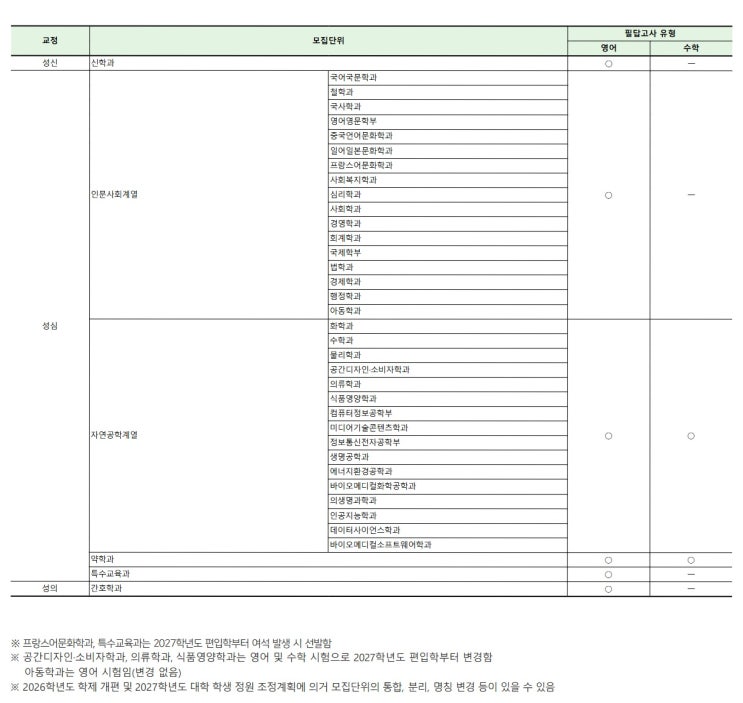 안녕하세요 이찬이 편입학원 입니다 2027학년도 가톨릭대학교 편입학전형 필답고사 유형관련 변경사항을 공지합니다 ※ 프랑스어문화학과, 특수교육과는 2027학년도 편입학부터 여석 발생 시 선발함 ※ 공간디자인·소비자학과, 의류학과, 식품영양학과는 영어 및 수학 시험으로 2027학년도 편입학부터 변경함. 아동학과는 영어 시험임(변경 없음) ※ 2026학년도 학제 개편 및 2027학년도 대학 학생 정원 조정계획에 의거 모집단위의 통합, 분리, 명칭 변경 등이 있을 수 있음 2027년 가톨릭대학교 편입시험을 준비하는 모든 학생들이 좋은 결과가 있기를 바랍니다 https://ipsi.catholic.ac.kr/detail.do?menuurl=shTyaGgSAy79vI5n2yB%2FhA%....... <img src="https://blogthumb.pstatic.net/MjAyNjA0MDFfODIg/MDAxNzc1MDI1NzAzODI0.x8VZeOM48jTO_udYDGlXavM_CJ6XD-YrgRCYewS8uzwg.-Gsjfmd7MnH-_3KGSjtSI_7qW-oadD4XYs0RDJY_7msg.JPEG/%B0%A1%C5%E7%B8%AF%B4%EB%C7%D0%B1%B3.jpg?type=s3" />