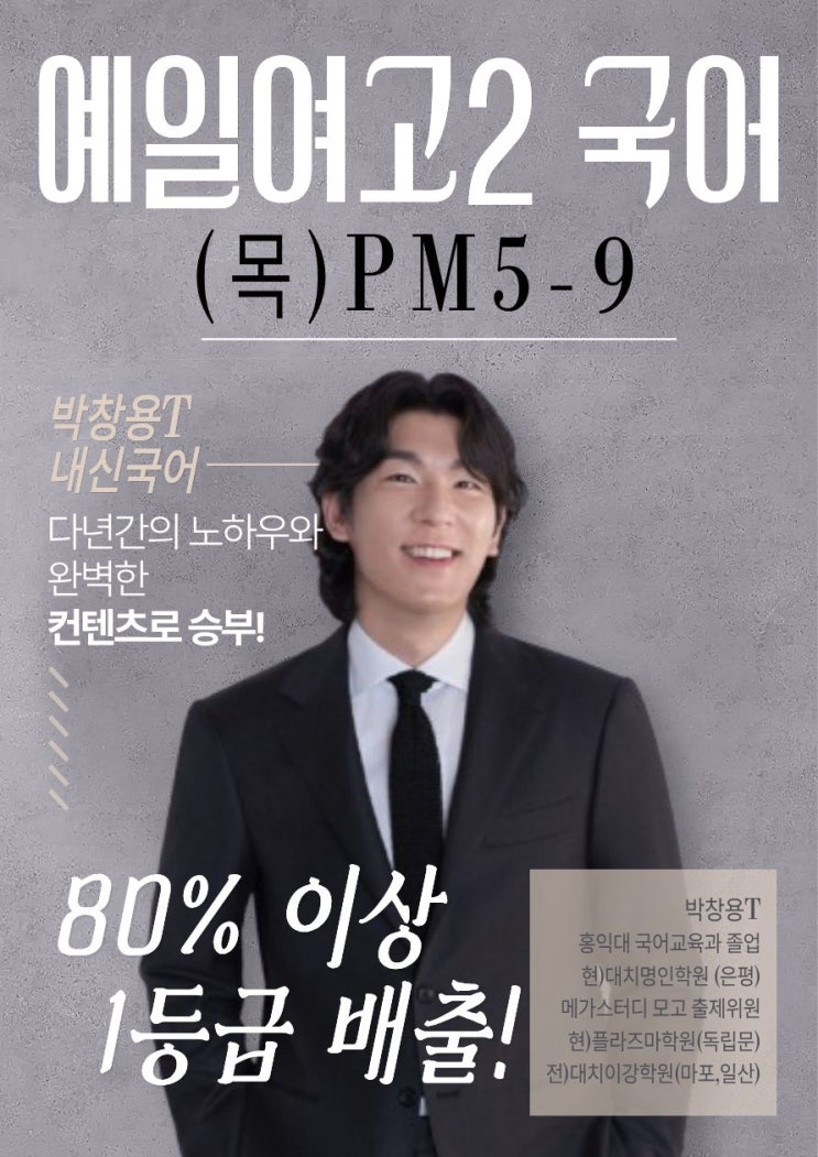 (목) PM 5-9 은평구 권내 국어 전교권 매년 배출의 신화! 내신반 학생 80% 이상 1등급! 그 누구도 범접할 수 없는 자료 학생들의 시선을 사로잡는 강의! 예일여고 국어 내신 시험은 세밀한 출제 경향과 더불어, 2학년부터는 수능형 문항 비중이 높아지기 때문에 전략적인 접근이 필요합니다. 박창용T의 다년간의 노하우와 완벽한 컨텐츠로 예일여고2 국어를 책임지겠습니다!! - 박창용T - 홍익대 국어교육과 졸업 현) 대치명인학원 (은평) 메가스터디 모고 출제위원 현) 플라즈마학원(독립문) 전) 대치이강학원(마포,일산) 대치명인은평캠퍼스 상담 및 문의 : 02-354-0058 문자전용 : 010-6221-0052 #은평명인학원 #대치명인은평캠퍼스....... <img src="https://blogthumb.pstatic.net/MjAyNjA0MDRfMTYw/MDAxNzc1Mjg5MTMzOTI5.nUHftwMLw1Ol7Uc7PlTOWSwpiJ799NKYYBd2_-tkqxcg.X21OPe4d_zsFEb-lG0MZ2lSWaK7CmKptEultyl8Q2FEg.JPEG/%B9%DA%C3%A2%BF%EBT_%B0%ED2_%C7%D0%B1%B3%BA%B0_%282%29.jpg?type=s3" />