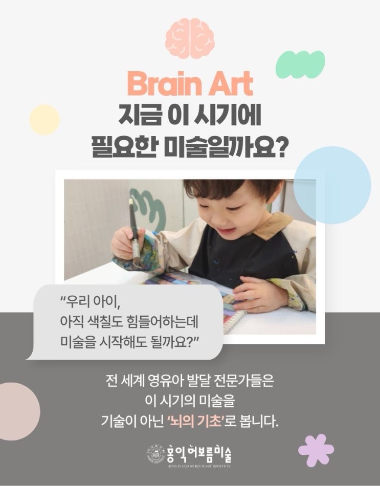우리 아이, 아직 색칠도 힘들어하는데 미술을 시작해도 될까요? 많은 부모님들이 이렇게 묻습니다. 하지만 전 세계 영유아 발달 전문가들은 이 시기의 미술을 ‘기술 교육’이 아니라 ‘뇌의 기초를 만드는 과정’으로 봅니다. 진주평거동미술학원 홍익허보름미술학원의 Brain Art는 그림 실력을 키우기 위한 수업이 아닙니다. 뇌 발달의 토대를 만드는 수업입니다. 유년기 뇌 발달의 핵심 유년기 뇌 발달에서 중요한 것은 단순합니다. 손을 충분히 쓰는 경험 실패해도 안전한 환경 생각을 행동으로 옮기는 과정 이 세 가지를 충분히 경험한 아이는 이후 집중력, 조절력, 사고력이 안정적으로 자랍니다. 홍익허보름미술학원은 이 원리를 수업 구....... <img src="https://blogthumb.pstatic.net/MjAyNjAzMDNfMjIg/MDAxNzcyNTI2MzMzOTMw.ersJKIViaLXZv3hIcwvFKlTs31fxS85h5eOFEHIBjMcg.s8ZlCvwNygdbJKcX-ZbzKxirIgAQxuHFefw6853a0Log.JPEG/%C8%AB%C0%CD%C7%E3%BA%B8%B8%A7%B9%CC%BC%FA_%C0%DA%B7%E1%BD%C7_%BB%E7%C1%F8_20260213_1.jpg?type=s3" />