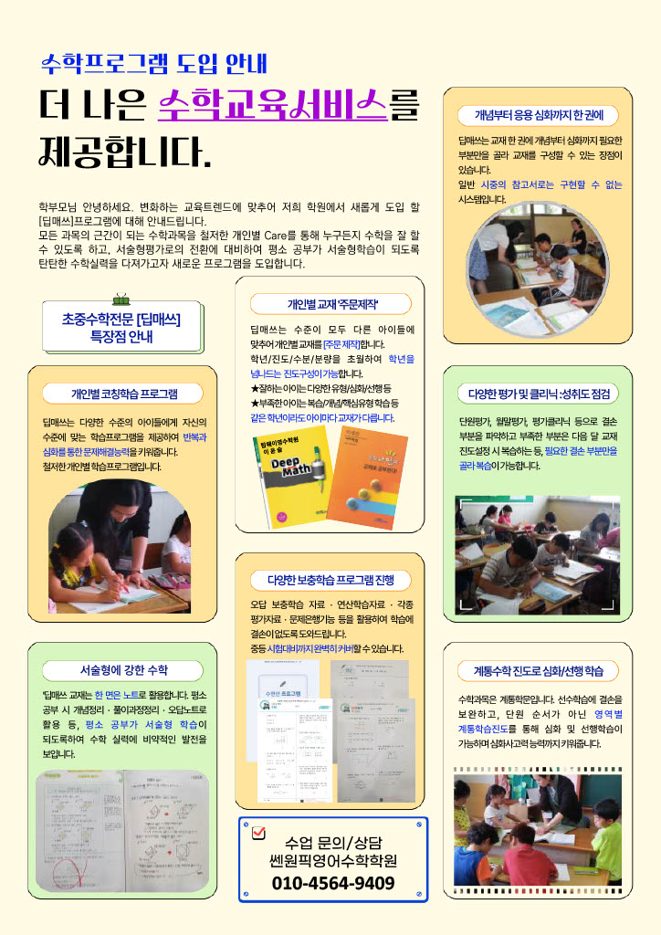 유사문제 만들기 틀린 문제를 내가 다시 한 번 유사문제로 만들어 풀어 본다면 다시는 틀리지 않겠지요. 오답클리닉을 내스스로 해보는 좋은 방법입니다. 수학일기, 만화로 표현하기 내가 알게 된 수학을 이용하여 일기나 만화로 표현해 본다면 학습에 흥미와 재미를 주어 수학이 재미있어지겠지요. 창의력과 미술과 국어가 통합된 통합 학습으로 굿입니다. 계산공간으로 활용하기 계산하는 공간으로 활용하여 내가 어디에서 계산 실수가 발생하는지 알게 되면 계산 실수를 줄일 수 있어요. 계산을 넓은 공간에서 여유롭게 또박또박 적어서 한다면 실수가 많이 줄어들고, 계산과정도 잘 정리할 수 있어요. 학습습관 길들이기 이 모든 것을 스스로....... <img src="https://blogthumb.pstatic.net/MjAyNjAzMzBfNTAg/MDAxNzc0ODUxODk1MjQ2.gEGWQkyOBW0fwUjyPKSOyP9p2MI_Mv2-HMU5tZCOUIMg.ZLT4OF2pxUDa6qxQtr-94kcSfza2EmPTOAYoO94z9Rwg.JPEG/KakaoTalk_20260312_150557023.jpg?type=s3" />