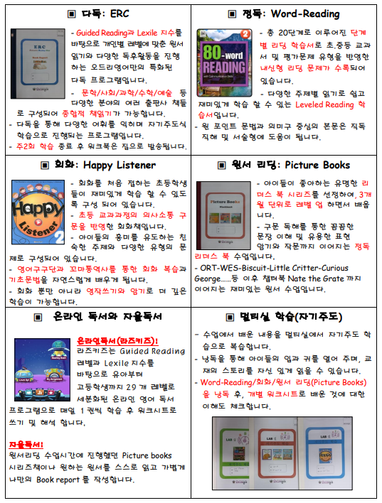 오드리영어 커리큘럽 안내입니다. 파닉스 학습 후 진행하는 초등 커리큘럼입니다. 주3회 수업 : 정독1회 / 다독2회 / Picture Books 원서 / 회화수업 / 리뷰학습 /라즈키즈 온라인 독서 / 멀티실 단어 및 해석 워크시트 학습까지 진행합니다. 읽기 3년차 또는 5학년부터는 본격적인 단어암기 / 듣기 / 문법도 시작됩니다. 소수정원에 개별적 레벨별로 다른 수업(다독, 단어, 듣기)도 학습되기에 초밀착 과외식 수업이 가능합니다. <img src="https://blogthumb.pstatic.net/MjAyNjAzMDNfNjQg/MDAxNzcyNTM4NTAyNjQw.V3HI6pj6uQmNvUyJSSZC7KsgVq3sT4V1l53GGlMKlQ4g.ETofTJcjGGh0OkueOhzwAsT_2N1DfxMNUjlogNI68yIg.PNG/image.png?type=s3" />