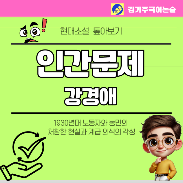안녕하세요, 깊이 있는 안목으로 국어의 맥을 짚어드리는 김기주 국어 주클래스입니다. 오늘은 1930년대 카프 문학의 기념비적 작품이자, 당시 농민과 노동자의 처참한 현실을 가장 사실적으로 그려냈다고 평가받는 강경애 작가의 『인간 문제』를 함께 분석해 보겠습니다. 감상의 길잡이 이 작품은 지주에게 착취당하는 가난한 농민들의 삶에서 시작하여, 일자리를 찾아 도시로 이주한 후 노동자로서의 계급 의식을 각성하는 과정을 보여주는 사실주의(리얼리즘) 소설입니다. 단순히 가난을 한탄하는 데 그치지 않고, 왜 인간이 인간답게 살지 못하는가라는 근본적인 '인간 문제'를 제기합니다. 농촌의 착취 구조를 다룬 전반부와 도....... <img src="https://blogthumb.pstatic.net/MjAyNjAzMDFfMjA0/MDAxNzcyMzc0ODI1MDE2.50HMLY6DLT0_WBB_78JmGE5UwvxVSShIEhPCB1wxBwEg.iBJq8YSmdvbd_qGq51dMaG7hluK6p26oxx-UmegIu5Qg.PNG/%C6%C4%B6%F5%BB%F6%B0%FA_%C8%B8%BB%F6_%BD%C9%C7%C3%C7%CF%B0%ED_%B1%F2%B2%FB%C7%D1_%BA%F1%C1%EE%B4%CF%BD%BA_%C4%AB%B5%E5%B4%BA%BD%BA_%C0%DB%BC%BA_%BF%E4%B7%C9_%BE%C8%B3%BB_%B5%F0%C0%DA%C0%CE_%C5%DB%C7%C3%B8%B4_%C0%CE%BD%BA%C5%B8%B1%D7%B7%A5_%C6%F7%BD%BA%C6%AE%C0%C7_%BB%E7%BA%BB_%2829%29.png?type=s3" />