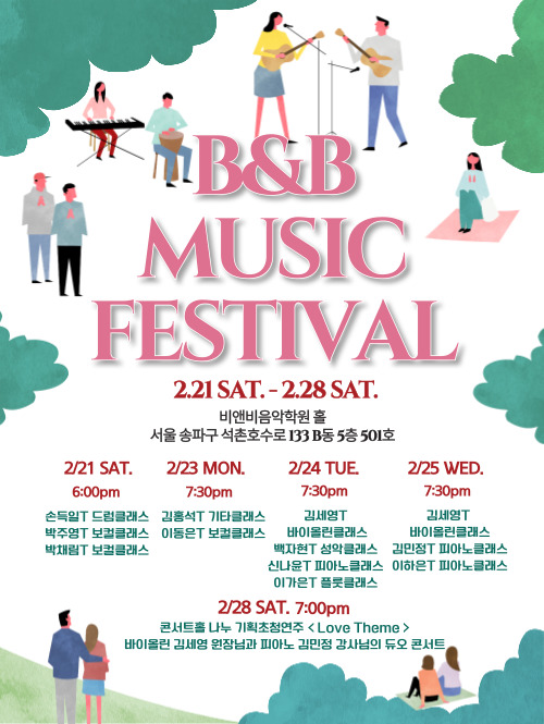 안녕하세요~ 비앤비 음악학원입니다! 2월의 막바지, 매서웠던 추위가 가시고 슬슬 봄이 올 것 같은 날씨죠~! 오늘은 비앤비 음악학원의 새소식을 들고 찾아왔답니다! 바로바로, 비앤비 음악학원 <BnB Music Festival>공연이 개최된다는 사실~! 비앤비만의 노하우와 훌륭한 강사진들로 이루어진 학원에서 음악에 대한 열정을 불태웠던 비앤비 음악학원 수강생들의 공연 무대가 준비되어 있답니다~ ♬<BnB Music Festival> 공연 일정 안내♬ ♪2월 21일(토) 오후 6:00 ♪2월 23일(월) 오후 7:30 ♪2월 24일(화) 오후 7:30 ♪2월 25일(수) 오후 7:30 연습실의 작은 도전들이 모여 하나의 무대가 되었습니다. 비앤비 수강생들의 열정과 성....... <img src="https://blogthumb.pstatic.net/MjAyNjAyMjFfMjQz/MDAxNzcxNjM5MTE5NTI4.KIFoWfwso_hr1JESxPh7A1R29zN_GSIlXumtTEFNEoEg.lxWCCG0r4ShrEy7xH8XqQwFbG4K5fmLZzO00ppxn1uYg.JPEG/%BD%C5%B3%E2%C0%BD%BE%C7%C8%B8_%B0%EE%B8%AE%BD%BA%C6%AE_%BA%B9%BB%E7%BA%BB-001.jpg?type=s3" />