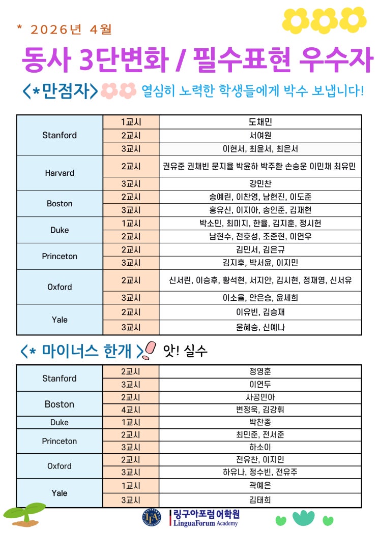 장유링구아포럼 재원생과 학부모님께! "학원의 가장 멋진 인테리어는 그 공간에 머무는 학생들의 열정이다." 중간고사가 한참 진행 중인 4월말, 지금 우리 아이들은 힘들지만 열정적인 모습입니다. 우리 링구아 공간 안에서 몰입하고 있는 예쁜 아이들을 지켜보며, 저는 이 아름다운 공간에 함께하고 있다는 사실에 감사함을 느낍니다 "공간은 그곳에 있는 사람의 에너지를 닮아간다." 우리 링구아는 따뜻합니다. 공부의 밀도는 치열하지만, 그 이면에는 아이들의 마음을 어루만지는 온기가 흐릅니다. 아이들의 영어 실력 향상을 위해 머리를 맞대고 고민하는 선생님들의 애씀이 지칠 수 있는 아이들을 열심히 움직이게 하는....... <img src="https://blogthumb.pstatic.net/MjAyNjA0MjRfMTk0/MDAxNzc3MDIwNzM1NTYw.qShbrdXHtjCywzlsye-7R16ZDeAgKMPcJiiPQYaTap8g.8GKrTG1oPM6O_kNEiLbe87-jLCdOO7N2gMrlDETJs98g.JPEG/%C1%A6%B8%F1%C0%BB-%C0%D4%B7%C2%C7%D8%C1%D6%BC%BC%BF%E4_-002_%2819%29.jpg?type=s3" />