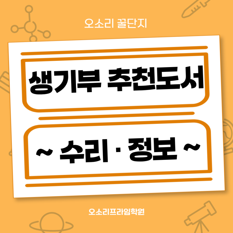 안녕하세요~ 오소리프라임학원입니다! 영재학교나 과학고를 준비하다 보면 생기부 독서 활동을 어떻게 준비해야 할지 고민하는 경우가 많다. 특히 수학이나 정보 분야는 문제집을 많이 푸는 것만으로는 충분하지 않다. 어떤 책을 읽고, 그 내용을 어떤 관점으로 이해했는지도 중요한 평가 요소가 되기 때문이다. 그래서 이번 글에서는 2025학년도 영재학교 추천도서 목록 중에서 수리·정보 분야 추천 도서를 정리해 보려고 한다. 한국과학영재학교, 인천과학예술영재학교, 광주과학고에서 실제로 추천한 책들 가운데 수학적 사고력이나 알고리즘 이해 컴퓨터과학의 기본 구조를 이해하는 데 도움이 되는 책들을 중심으로 소개한다. 1. 『리만 가....... <img src="https://blogthumb.pstatic.net/MjAyNjAzMTZfNTgg/MDAxNzczNjYzNjczMDIy.iJae6v77IN26y4PE0fEd3pjeOdkU5fLRE-KzLt9sbRkg.xtr8BslwARcrY51mWSpli4V0jsMdL9XTN98XNa1t_jQg.PNG/%BA%ED%B7%CE%B1%D7_%284%29.png?type=s3" />