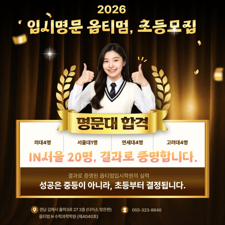 안녕하세요 학생의 성장을 최우선으로 하는 옵티멈N수학과학학원입니다. 선행이 아니라 입시 구조부터 다릅니다 초등 공부는 다 비슷해보입니다. 학원도 많고 교재도 비슷하고 숙제도 비슷합니다. 하지만 중학교에 올라가는 순간, 아이들의 성적은 극단적으로 갈립니다. 차이는 재능일수도 있지만, 공부 방식의 차이가 크다고 봅니다. 우리 옵티멈학원에서는 초등3학년부터 단순 관리형 수업이 아닌 중.고등 입시 기준으로 다시 설계하여 중학교, 고등학교까지 흔들리지 않는 기본기 구조를 만드는 것이 목표입니다. 다시말해 초등부터 입시 방식으로 키우는것, 그것이 OPTIMUM 초등 과정의 핵심입니다. 결과로 이미 증명된 사실입니다. 중.고등....... <img src="https://blogthumb.pstatic.net/MjAyNjAxMjNfNDkg/MDAxNzY5MTYyMTY3NzM3.WeuP688VZLN3fYIZtfkvYtsIrSVKvA9E0VyDZ9vH4log.yLVCp2l_d8i4CfT3CdMeGE8zgRK9A7UC4eOOIeMqi1Ig.JPEG/001.jpg?type=s3" />
