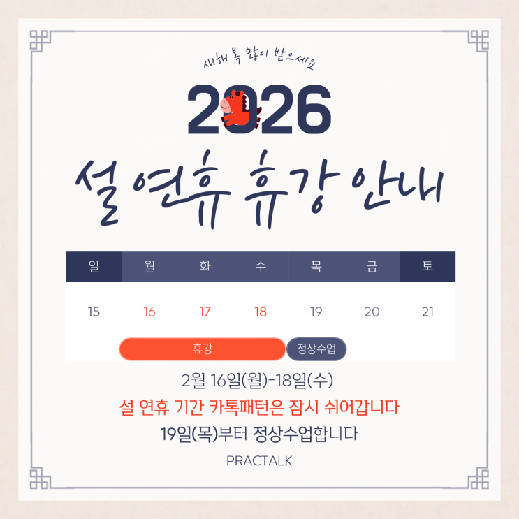 안녕하세요 :) 프랙톡 입니다! 2/16~18(3일간) 설 연휴 휴무 안내 드리오니 상담/ 수업 문의 등 참고 부탁드려요! 2026년 원하는일 모두 이루어지길 바라겠습니다! 행복한 연휴 되세요! <img src="https://blogthumb.pstatic.net/MjAyNjAyMTRfODEg/MDAxNzcxMDQyNjI3MDQ3.MbiwXDMKRf2mOatVLWHyx81o9u8HgwHUTCWqWXQvbLgg.pRm7CUNIy8GGWKj37Z7dEj0r7QU0wUzH6MinR2Jlkngg.PNG/1-1%BC%B3_%C8%DE%B0%AD%BE%C8%B3%BB.png?type=s3" />