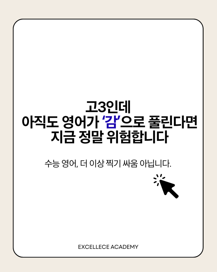1️⃣ 고3 영어, 왜 ‘감 독해’가 통하지 않을까? 고3이 되면 영어 문제는 단순 해석이 아니라 논리 구조와 근거 판단을 요구합니다. 이때 감으로 푸는 학생은 지문이 조금만 복잡해져도 바로 흔들립니다. 2️⃣ 감으로 푸는 학생들의 공통 특징 해석을 정확히 못 하지만 문제는 맞힐 때가 있음 답의 근거를 설명하지 못함 빈칸·순서 문제에서 유독 약함 이 상태는 지금은 괜찮아 보여도 실전에서 가장 먼저 무너집니다. 3️⃣ 수능 영어, 실력은 ‘재현 가능성’입니다 실력 있는 학생은 왜 이 답인지 설명할 수 있고 다른 지문에서도 같은 방식으로 풉니다. 반면 감으로 푸는 학생은 컨디션·난이도에 따라 점수가 요동칩니다. 4️⃣ 엑설....... <img src="https://blogthumb.pstatic.net/MjAyNjAxMTVfMTU4/MDAxNzY4NDY3NTE5MjE1.WZWtKvdwMfa9WDRsDwkrO9KE2LaaI_I4xTtA5lFYfWog.Z4-TwMMWS69LyQPzO72NWq-YF9-UreCZlLiQsrA9C3Ug.PNG/1.png?type=s3" />