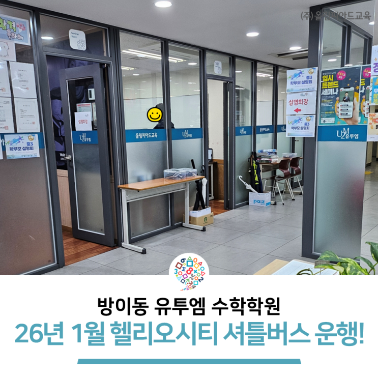 안녕하세요. 올림피아드교육 유투엠(U2M)수학학원 공식 블로그입니다. 오늘은 헬리오시티 학부모님들께 반가운 소식을 전해드리려고 합니다. 그동안 통학 및 셔틀 노선 관련 문의를 주신 학부모님들이 계셨는데요. 드디어 2026년 1월부터 헬리오시티 셔틀 노선이 신설되어, 이제 방이동 유투엠 수학학원을 더 편하게 보낼 수 있게 되었습니다 오늘 포스팅에서는 셔틀 운행 안내와 함께 방이 유투엠의 초·중·고 학습 관리 포인트를 간단히 소개해 드릴게요 방이동 학원가 수학학원을 찾고 계셨다면~ 집중해 주세요! 초·중·고 수학전문학원! 헬리오시티 / 파크리오·르엘·래미안아이파크 / 파크포레온 셔틀 운행 초등 오....... <img src="https://blogthumb.pstatic.net/MjAyNjAxMTVfMjQ2/MDAxNzY4NDUxNDY0NjAz.k_1j4QUgmh4V2iWvweEcDwp7YCQO7i08Y3MnFca94akg._nY-NKqaI8hfOO8fjii-Dd0QiR7PteMN2QvluRd5DQ0g.PNG/%C7%EF%B8%AE%BF%C0%BD%C3%C6%BC_%BC%F6%C7%D0%C7%D0%BF%F8.png?type=s3" />