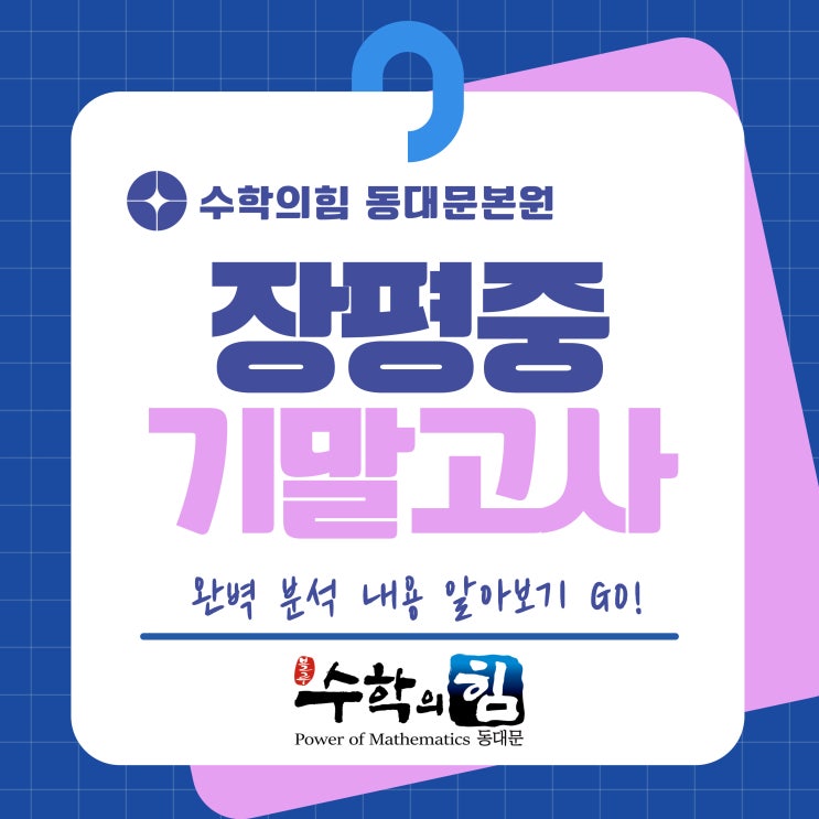 안녕하세요^^ 장안동 수학의힘 수학의힘 동대문본원입니다! 이번주 소식은 장평중 2학기 기말고사 입니다! 장평중 1학년 2학기 기말고사 이번 장평중 1학년 2학기 기말고사는 단원별로 다음과 같이 출제되었습니다. * 평면도형의 성질 3문항 * 입체도형의 성질 12문항 * 여러 가지 자료의 정리 10문항 특히 '입체도형의 성질'은 중단원이 많아 비교적 많은 문항이 출제되었으며, 고난도·고배점 문항 역시 입체도형의 겉넓이와 부피 단원에 집중되었습니다. 전반적인 출제 방향은 교과서를 기반으로 한 학습 내용을 점검하는 평가로, 난이도 자체는 평이한 편이었습니다. 다만 시험 진행 과정에서 문항의 조건이나 수정 사항이 뒤늦게 확....... <img src="https://blogthumb.pstatic.net/MjAyNjAxMTVfNjUg/MDAxNzY4NDgwMDIxNTQ4.s75hS6G_3zxrdZV39KHjhBbiYEsJW1WGZH_vMoiRWVgg.DYS2ZA8hxrd1bV69mWA8l9kD-xiTkHVfTFrQBlzkGKAg.JPEG/001.jpg?type=s3" />