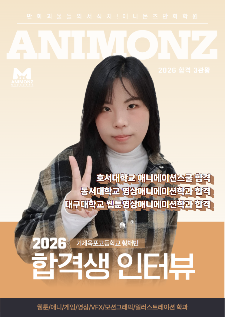 안녕하세요 여러분 웹툰/애니메이션/게임/영상 VFX/모션그래픽/일러스트레이션 학과 거제 합격 1위! 거제 만화 애니 합격 1위 학원 ! 거제 애니몬즈 만화학원 입니다 2026학년도 호서대학교 애니메이션스쿨 동서대학교 영상애니메이션학과 대구대학교 웹툰영상애니메이션학과 합격 ! 3개의 학교를 합격한 거제 옥포고등학교 3학년 황채빈 학생의 합격 인터뷰입니다 멋진 우리 황채빈 학생의 인터뷰 만나보실까요 ! 거제 애니몬즈 만화학원은 여러해 명단을 합쳐서 올리지 않습니다 타지역 명단을 합쳐서 올리지 않습니다 합격년도와 출신고교를 확인해주세요 ! 6년 연속 청강대학교 합격 ! 합격으로 증명하는 진짜 만화학원 거제 애니몬즈 만화학....... <img src="https://blogthumb.pstatic.net/MjAyNjAzMThfMyAg/MDAxNzczODI0MTEwNjI0.6-Ao17xNIh77KsoNgUZl-_M_0yTfQW43PfCYJOHY7ocg.QFdruJlHyXiTiubQ1VHN2QUHng2RP6ScaoahLix5gUMg.PNG/%B0%C5%C1%A6_%B8%B8%C8%AD%C7%D0%BF%F8_%B9%CC%BC%FA%C7%D0%BF%F8_%C7%D5%B0%DD%BB%FD_%C0%CE%C5%CD%BA%E4_%C8%A3%BC%AD%B4%EB_%B5%BF%BC%AD%B4%EB_%B4%EB%B1%B8%B4%EB.png?type=s3" />