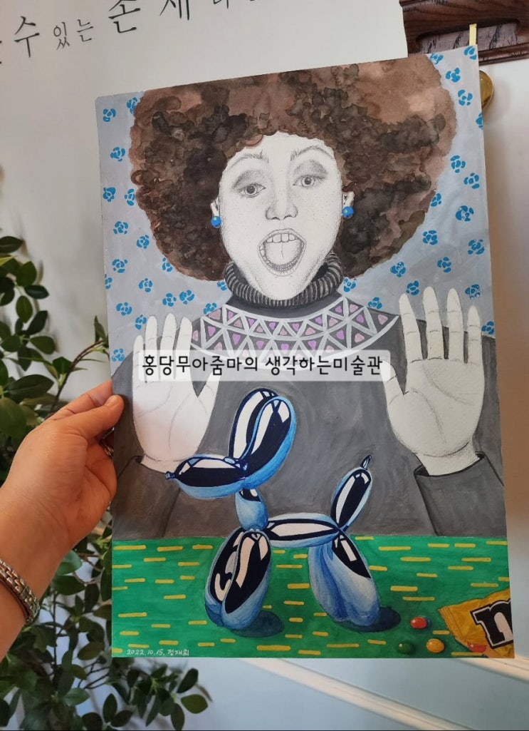 지.감 4.5.6 이번 수업에서는 미국의 현대 미술가 제프 쿤스의 벌룩독을 감상한 후 감상하는 모습을 각자의 생각으로 표현해 보는 시간이었습니다. 제프 쿤수의 작품 중 아이들에게 친숙한 풍선을 소재로한 거대한 벌룬독을 사실적으로 관찰 표현하는 수업입니다. 제프쿤스의 벌룬독 제프 쿤스는 예술과 상업의 경계를 허문 키치 미술의 대가로 그의 작품 <토끼>는 2019년 뉴욕에서 열린 크리스티 경매에서 1084억원에 낙찰되어 생존 작가 작품으로 최고가를 경신하였습니다. 생각하는미술관 생각쟁이들과 홍당무아줌마 생각하는미술관 생각쟁이들과 홍당무아줌마 생각하는미술관 생각쟁이들과 홍당무아줌마 생각하는미술관 생각쟁이들과 홍....... <img src="https://blogthumb.pstatic.net/MjAyNjA0MThfMTEx/MDAxNzc2NDk3MDQ3NTY1.wGEP260lXeDQU5Y45KGfyW4D1ds8UfbIhHHTKnTyrhYg.XDDWfifIQfjnUsPDFkkJnC9qd4za_TxDPxmPpVBVrtYg.JPEG/1776497047752.jpg?type=s3" />