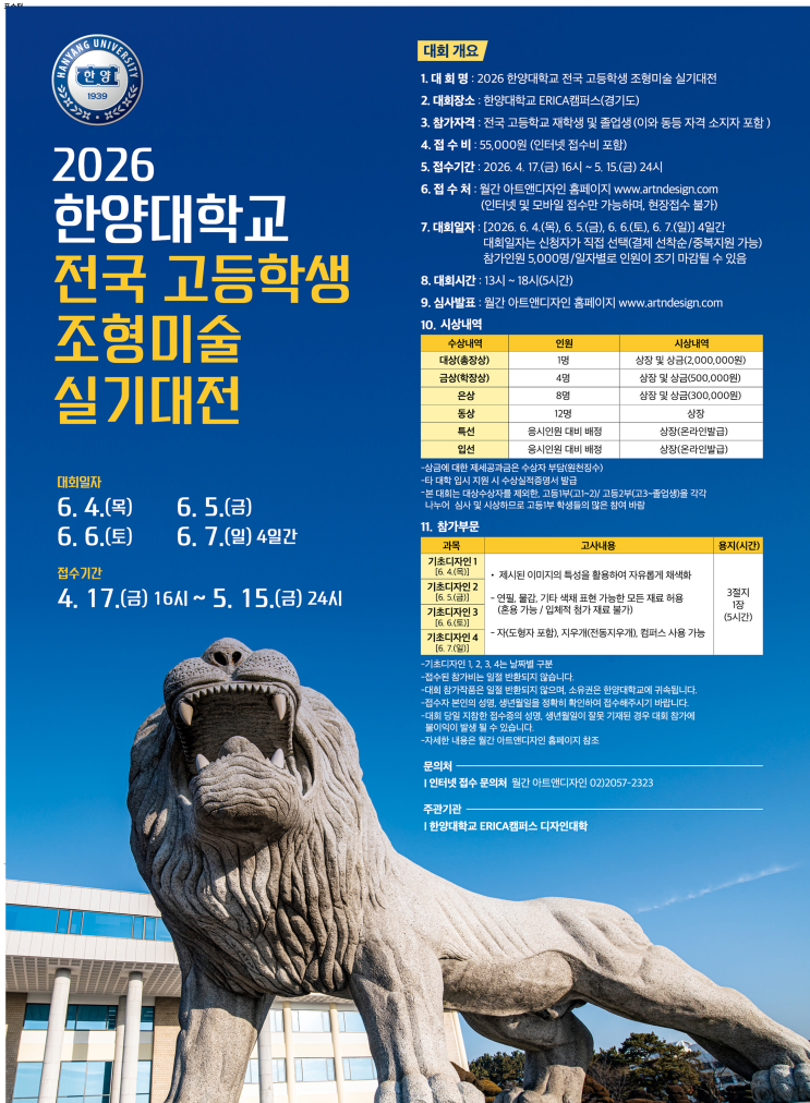 2026년 전국고등학생 조형미술 실기대회 주최 한양대학교 ERICA 캠퍼스 일시 2026년 6월 4일(목) ~ 2026년 6월 7일(일) 4일간 ※ 시험은 오후 1시부터 시작됩니다. - 고사장 입실시작은 11시40분부터 가능합니다. - 참가자는 대회일시 30분 전까지 입실합니다. (지각자 입실 불가) 장소 한양대학교 ERICA캠퍼스(경기도) ( 지도 링크 ) 포스터 | 참가자격 전국 고등학교 재학생 및 졸업생 (이와 동등 자격 소지자 포함) - 고등1부(예비반) 고등학교 1학년, 고등학교 2학년 재학생 - 고등2부(입시반) 고등학교 3학년, 고등학교 졸업생, 검정고시 취득, 검정고시 취득 예정 | 접수방법 온라인접수 | 접수기간 2026년 4월 17일(금) 16:00 ~ 5월 15일....... <img src="https://blogthumb.pstatic.net/MjAyNjA0MjBfMTcx/MDAxNzc2NjgxMDQ2Njkw.MUeQS80KPqRvRC_vworTI2q5N2TEgWSxJuy8oN6wHXwg.Mpw6fO4qOKaamzZ6ABk5yzHY2-RwT2UqE-K2BD4NZ_Mg.PNG/%B1%D7%B8%B21.png?type=s3" />