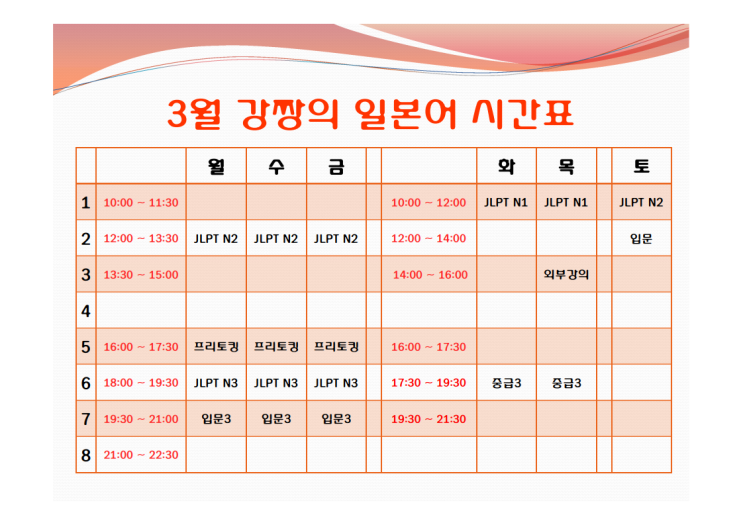 2026년 3월 시간표예요~! 3월 5일 (목) 개강입니다~! 희망하시는 시간에 맞춰서 시간 및 수강과목 변경이 가능하니 꼭! 연락을 주셔서 상담해 주세요~! (문의.010.8312.3409) 카카오톡ID 01083123409 <img src="https://blogthumb.pstatic.net/MjAyNjAyMTJfMTAz/MDAxNzcwOTAxODMwMDM4.6q_ZWvlv-mh1UOj3NeIn38I5jpkb9WcRQgnYszCdDS8g.YzuCx5c2obRrNdqyUTgmNoTphj3YAy1-drkCOmC3QSUg.PNG/3%BF%F9_%BD%C3%B0%A3%C7%A5.png?type=s3" />