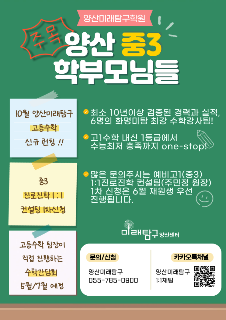 양산 중3학부모님 주목! ❶ 10월 양산미래탐구 고등수학 신규런칭! 최소10년이상 검증된 경력과 실적, 6명의 화명미탐 최강 수학강사팀! 고1수학 내신1등급에서 수능최저충족까지 one-stop! ▶ 고등 수학팀장이 직접 진행하는 수학간담회 5월/7월 예정 ▶ 5/20(수) 2028최종끝판왕 설명회 때 상세안내 드립니다. ❷ 많은 문의주시는 예비고1(중3) 1:1진로진학 컨설팅 (주민정 원장) 1차신청은 6월 재원생 우선 진행됩니다. [ 신청 방법 ] ☎️ 학원 전화 미래탐구 화명센터 (051.362.6436) 또는 미래탐구 양산센터 (055.785.0900) 카카오톡 채널 1:1 채팅 ▶ 전화 상담 가능 시간 평일 2:30PM ~ 9:00PM 토요일 10:00AM ~ 4:30PM 그 외 시간....... <img src="https://blogthumb.pstatic.net/MjAyNjA0MjFfOTAg/MDAxNzc2NzUyOTU1NTcx.kPURcDkkExCckpIV1nCge3fEXUaquKSioMKE-4Hxn9Ag.O5XG8E3lzJ8cx_E4Nmb6Cva3buhRFdigCMASWF3BbOYg.PNG/image.png?type=s3" />