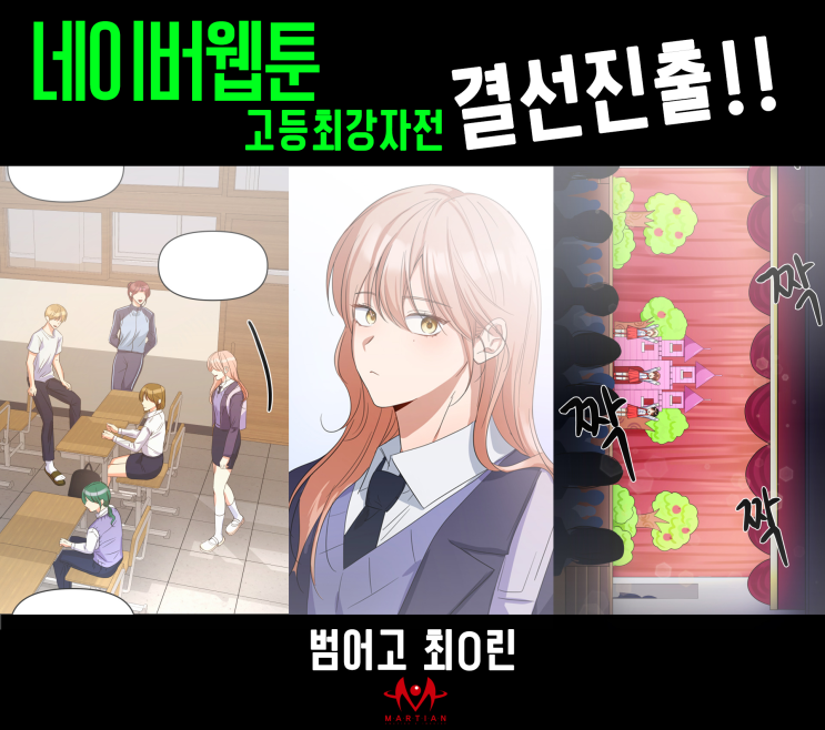 하이~~!!!(High~~!!!) 여러분 애니마션 하이클래스입니다! 많은 학생들이 웹툰 작가의 꿈을 꾸며 그림을 시작하곤 하죠! 우리 애니 마션의 많은 학생들도 언젠가 자신만의 스토리와 작품으로 네이버 웹툰에서 연재하는 것을 목표로 열심히 노력하고 있어요. 이런 예비 웹툰 작가 친구들에게 연재 기회가 걸린 공모전은 곧바로 웹툰 작가의 꿈을 이룰 수 있는 특별한 길입니다. 네이버 웹툰 고등 최강자전 공모전은 한국 만화 영상 진흥원과 네이버 웹툰에서 함께 진행한 공모전으로, 고등학생 인재를 발굴하기 위한 공모전이었습니다. 특히 상위 3작품은 정식 연재권을 부여하는 만큼 경쟁률이 엄청났었죠! 200편이 넘어가는 작품 중, 선정된 40작....... <img src="https://blogthumb.pstatic.net/MjAyNjAzMTRfNzcg/MDAxNzczNDUyNTY3MjIy.STO9i10Xoz92QpJ5LeTUYy-3XlkDrxXM-e0HZAeVTf0g.18rDXS6RtyB4F4RFK2XOKRiZzoGGrNfypZfyrrM4Wvcg.PNG/%C0%CC%B9%D2%C1%F6_.png?type=s3" />